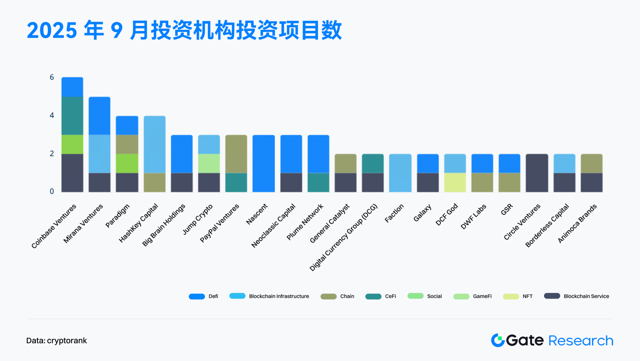 根据 Cryptorank 于 2025 年 10 月 9 日发布的数据,9 月 Web3 投资活跃度最高的机构主要集中在 Coinbase Ventures、Mirana Ventures 与 Paradigm,投资项目数量领先其他机构,显示其在行业早期阶段的持续主导地位。其中 Coinbase Ventures 是本月投资项目数最活跃的机构,布局覆盖 Blockchain Service、CeFi、DeFi、Social 等多个赛道,展现出其系统化、生态化的投资策略;而 Mirana Ventures 与 Paradigm 则更聚焦于 区块链基础设施与 DeFi 协议,延续了以技术创新与金融衍生为核心的双轮驱动战略。