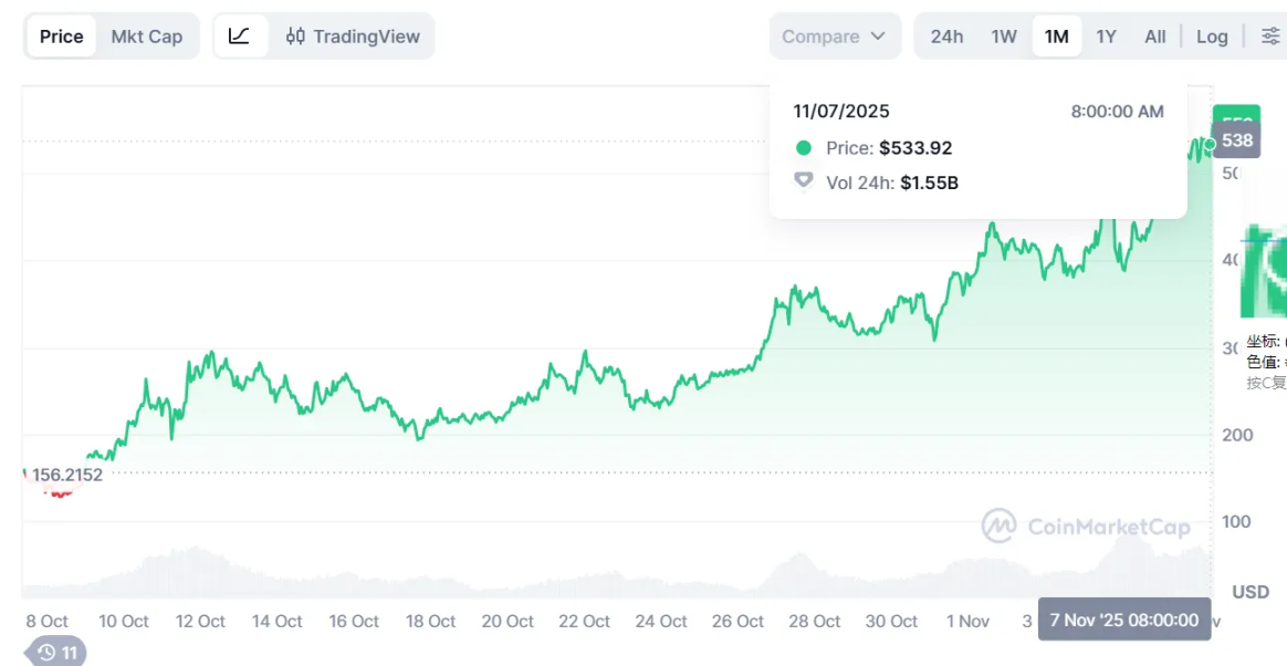 根据 CoinMarketCap 实时数据,Zcash 在 2025 年 10 月 8 日至 11 月 7 日期间从 $156.21 暴涨至 $533.92,30 天涨幅达到 241%(3.41 倍),较 2021 年 5 月的前高点 $319 上涨 67%,成功实现技术性突破。但值得注意的是,相较于 2016 年历史峰值 $4293,当前价格仍下跌 88%,说明 ZEC 距离真正的重回巅峰仍有巨大距离。