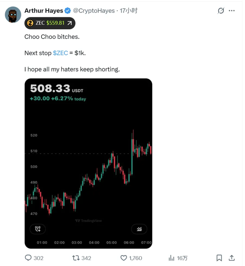 硅谷投资人 Naval 在 10 月 1 日背书 ZEC(当时 $68),提出"Zcash 是针对比特币的保险",一周内价格涨至 $150。BitMEX 创始人 Hayes 近期频繁喊单 ZEC,引爆散户 FOMO 情绪。加密 KOL Ansem 将 ZEC 置于与 BTC 同等地位。密集的顶级 KOL 背书制造了"FOMO"的市场氛围,但是也埋下"喊单出货"的隐患。