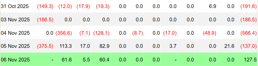 本周期内 ETF 资金大幅流出,尤其是 4 日及 5 日流出规模急增,反映出机构在市场不确定性增强期开始撤离或观望。11 月 6 日虽有少量回流,但幅度远低于前两日流出规模,整体仍呈流出格局。