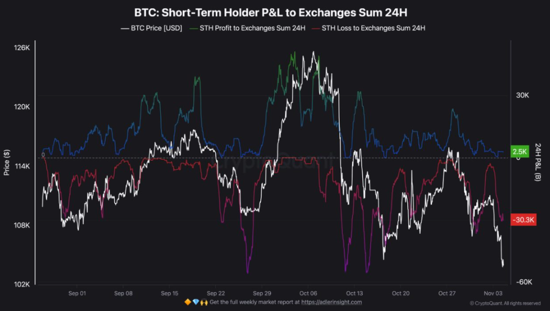 CryptoQuant 报告指出,短期持有者的亏损抛售正加剧市场下行压力。仅今日,就有约 30,300 枚比特币陷入亏损区间被转入交易所,显示出近期买家的“投降式”卖压明显上升。