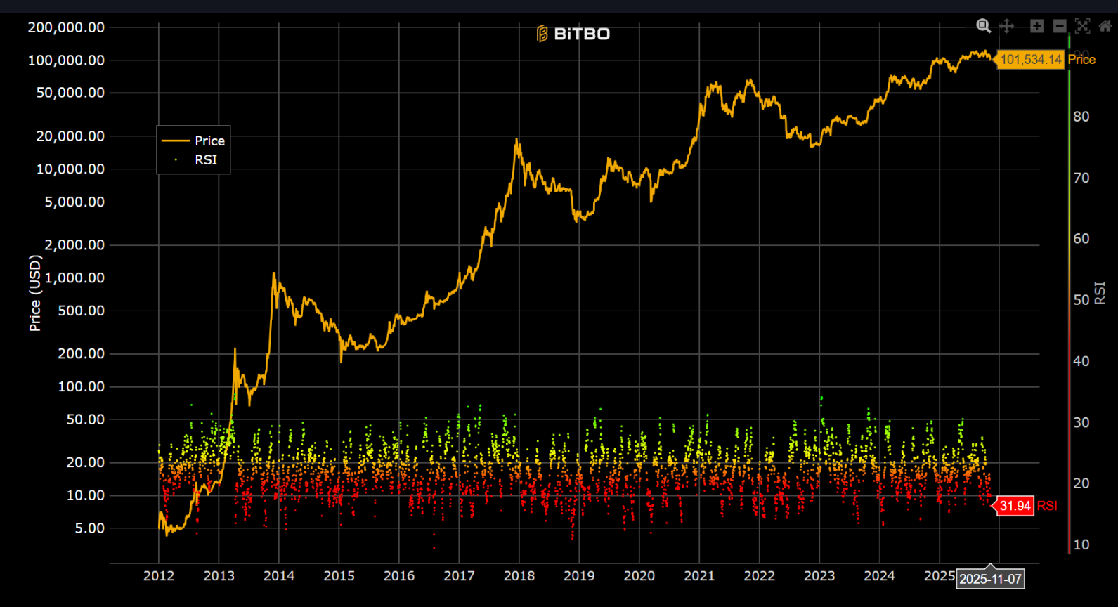根据最新数据,截至 11 月 7 日, RSI 约为 31.94,跌至偏弱水平。