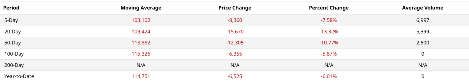 比特币已跌破 200 日移动平均线 (SMA)。比特币在 $109,000 基础上失去了关键支撑,目前徘徊在 $103,500 附近。下一个关键水平位于 $99,000,该水平历来在回调期间提供支撑。若能回升至 MA20($109,424)以上,将是反转信号;若持续低位,则可能测试更低支撑区。