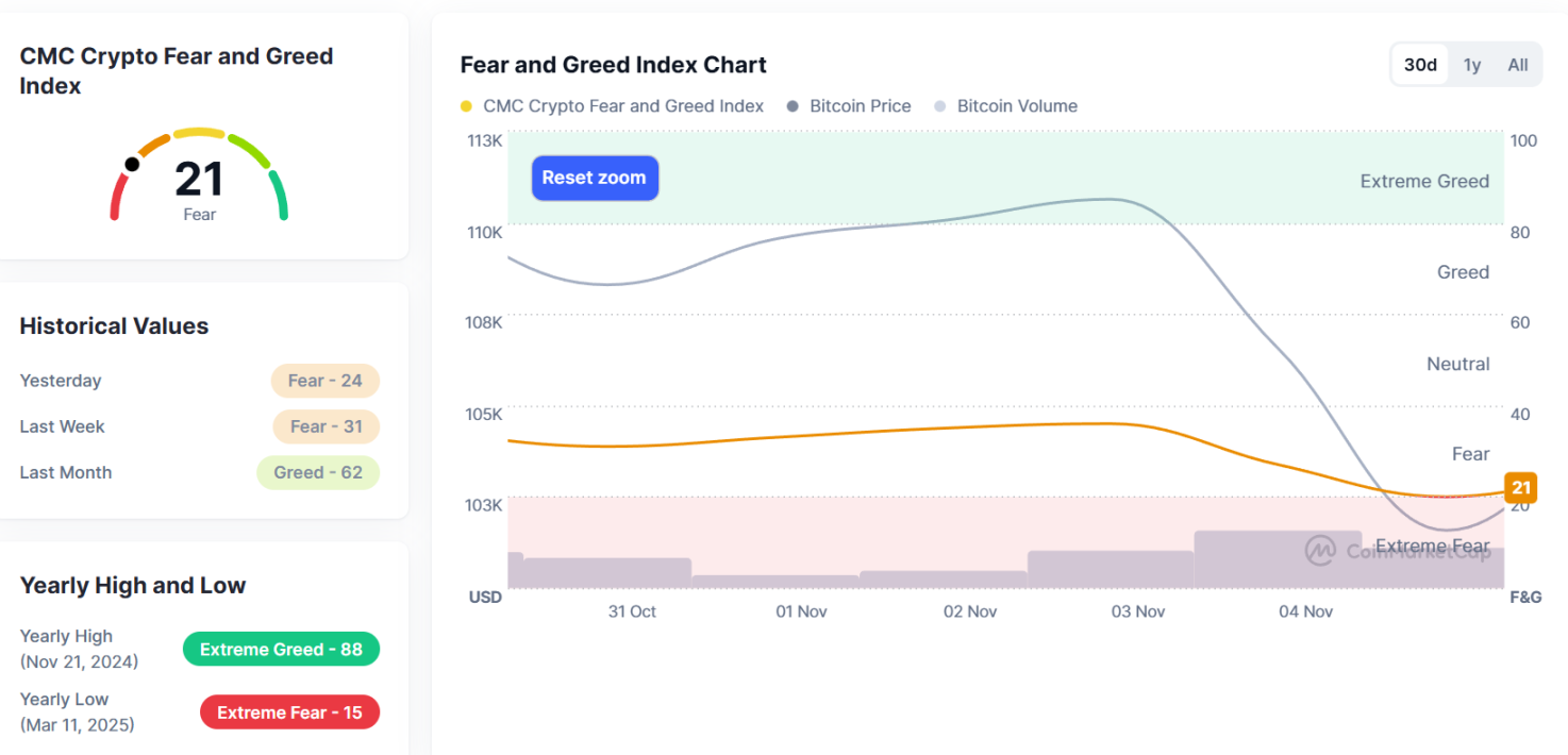 截至 11 月 7 日,本周期末恐惧与贪婪指数(Fear & Greed Index)报 21 点,处于“极度恐惧”区间。图片数据显示指数持续走低。