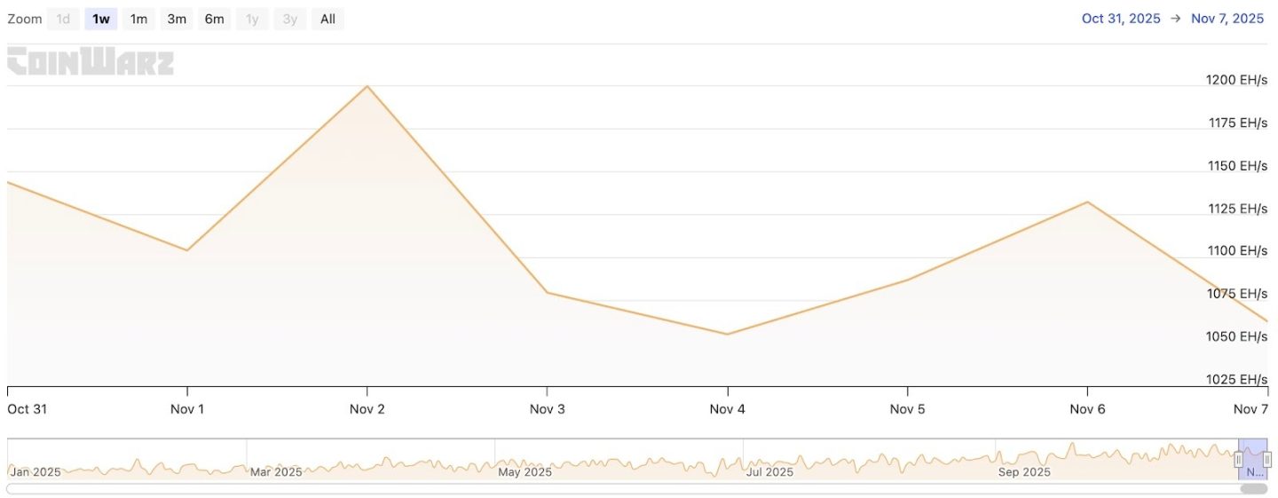 过去七天,比特币网络哈希率整体较为平稳,本周哈希率维持在 1055.21 EH/s 至 1200.10 EH/s 区间,处于相对高位。