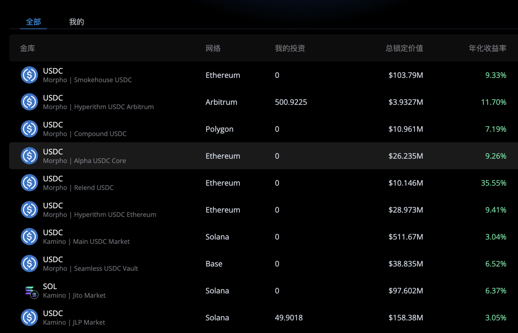 顾名思义,用户只需存入 USDC,即可参与赚取收益。下图显示了 DeGate 集成的部分金库。