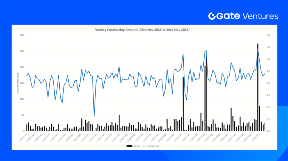 Total weekly fundraising rose to $250M for the 1st week of Nov-2025, an increase of +26% compared to the week prior. Weekly fundraising in the previous week was up +616% year over year for the same period.