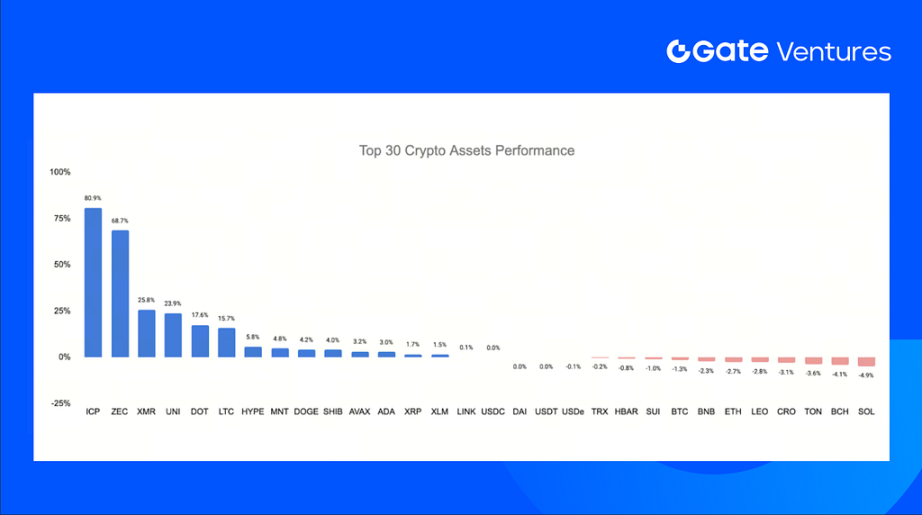 The altcoin market maintained strong momentum, led by ICP (Internet Computer), ZEC (Zcash), and XMR (Monero). ICP topped the list with an impressive 80.9% price gain. Fundamentally, ICP now boasts the highest real-time throughput in the market at 1,145 tx/s, surpassing even Solana’s 819 tx/s. (8)