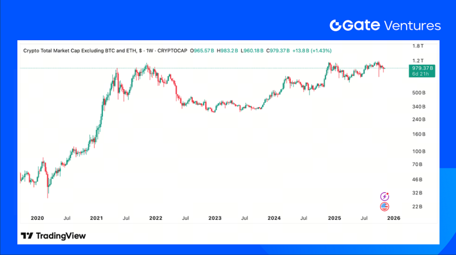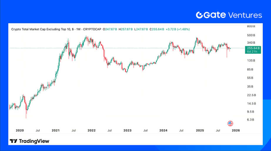 The total crypto market cap fell 5.26% last week, while the market excluding BTC and ETH declined 3.88%. BTC and ETH led the downturn, as the broader altcoin market (excluding top 10 dominance) saw only a mild pullback of 1.05%.