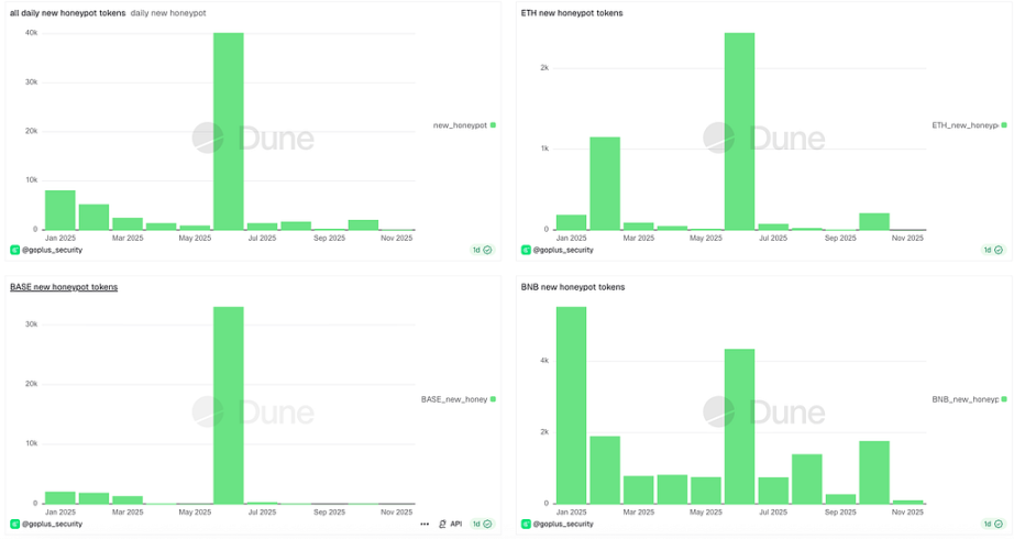 10 月在 ETH、Base、BSC 监测到新增貔貅代币(HoneyPot)2189 个,相较 9 月增长超 600%,其中: