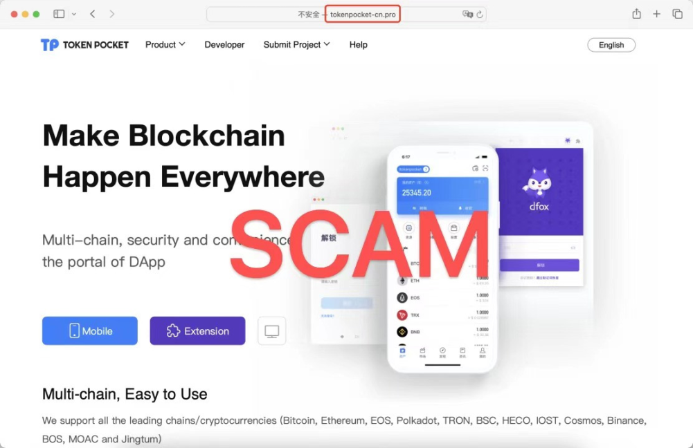 虚假钱包网站通常与虚假钱包应用相伴而生。通过创建高质量的复制网站并将其部署在相似的域名上,这些虚假网站通常比典型的 SEO 技术更具欺骗性。例如,虚假 TokenPocket 钱包网站 tokenpocket-cn[.]com 是合法域名 tokenpocket.pro 的假冒版本。其目的是误导投资者下载虚假钱包应用,从而导致其资产损失。