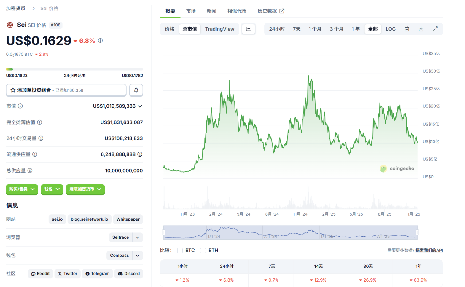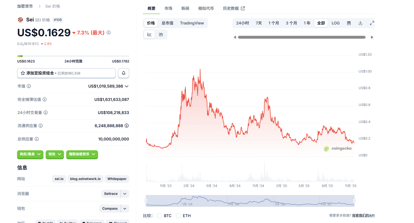 SEI 自上线以来基本随大的行情周期变化,并未出现太多的独立走势。目前处于上线后历史低点的 5 倍左右 FDV,但其代币单价在持续下跌接近历史低点。代币释放比例已经度过了新增高峰期,达到相对充足的阶段。
