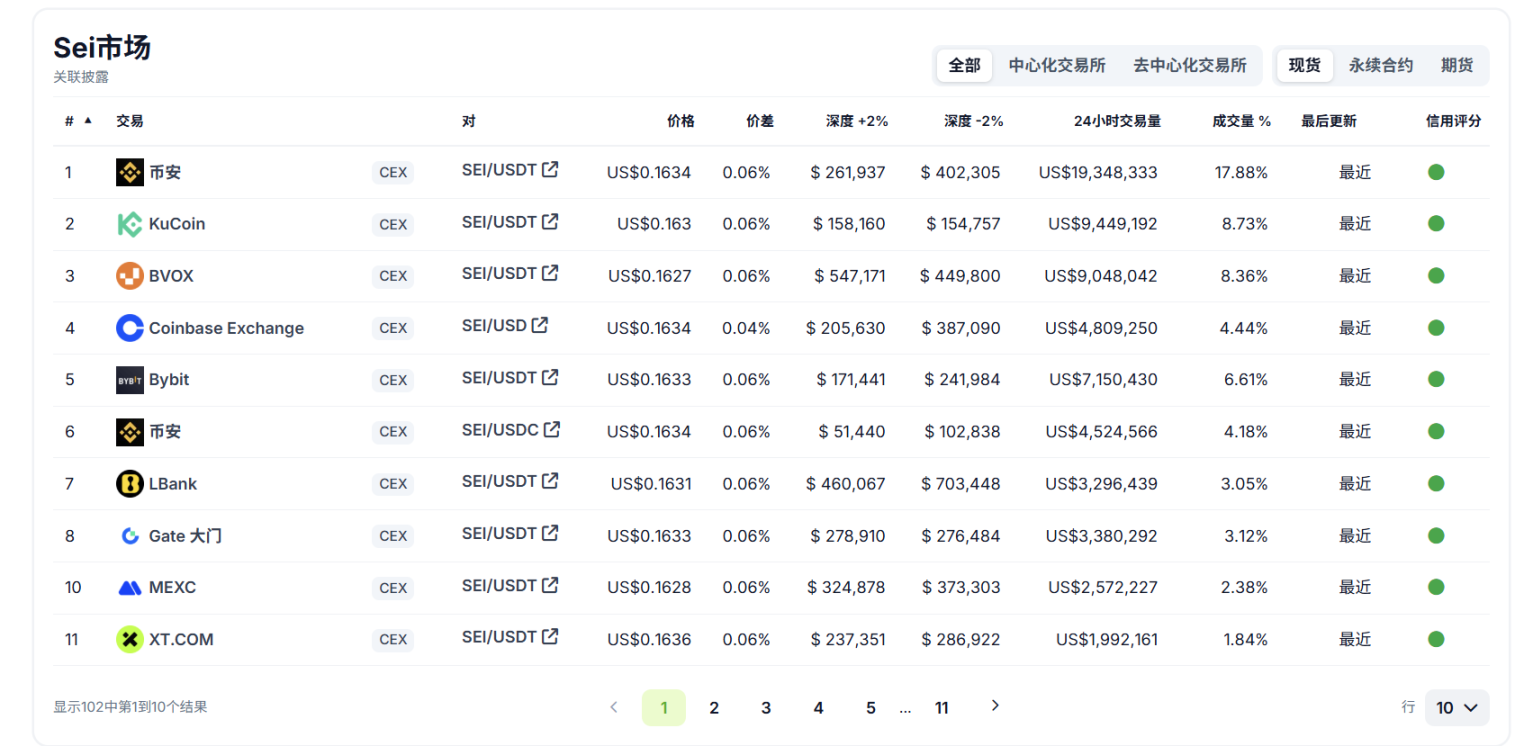 市场深度方面,Binance 和 Coinbase±2 深度综合超过 120 万美元,整体流动性充足。链上去中心化交易尚不多见,主要因 Sei DEX 尚在建设中。这也是因为 SEI 在生态和用户规模方面目前进展不佳。