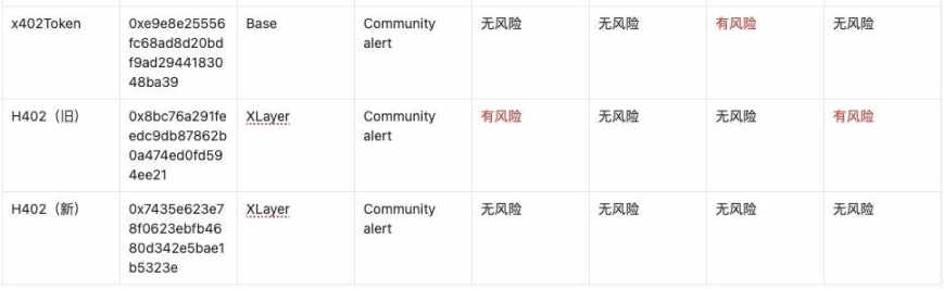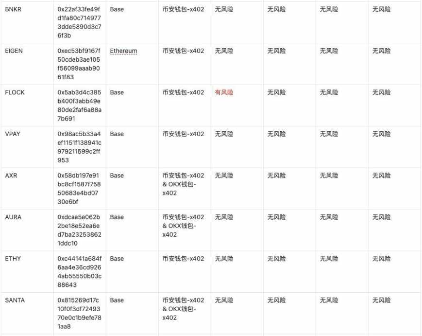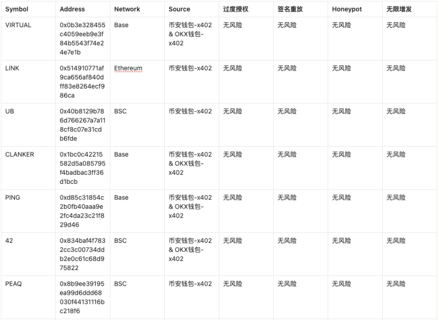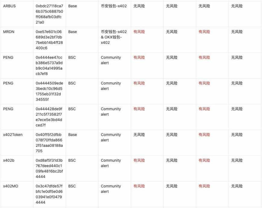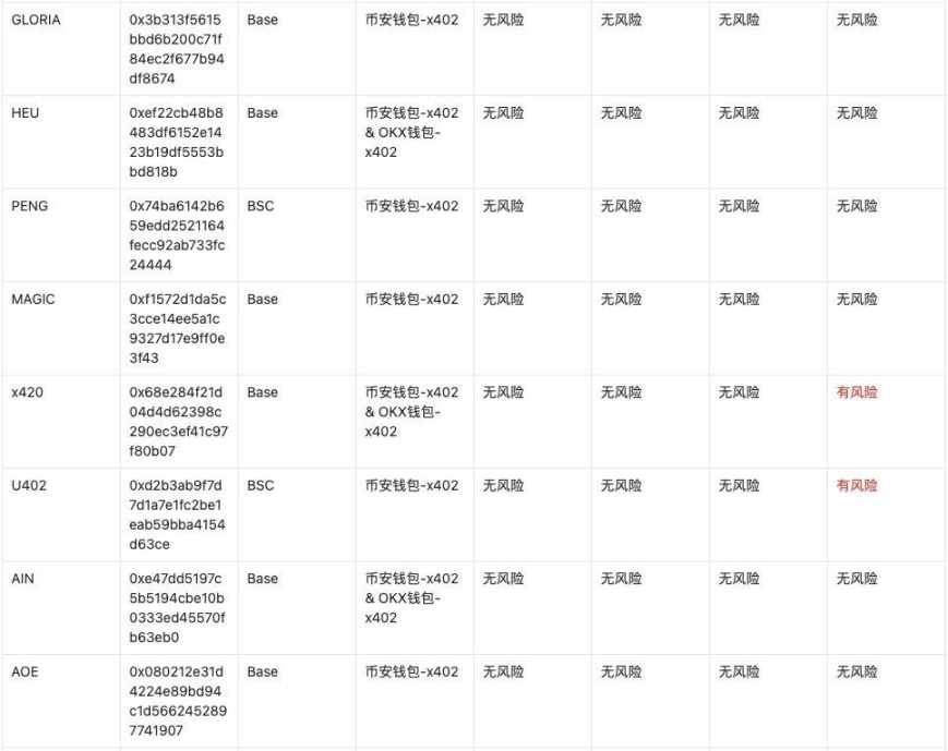 GoPlus 安全研究院基于领先的 AI Auditing 引擎,利用大模型和专业安全知识,对 Binance Wallet 和 OKX Wallet 中的 x402 项目、社区预警的风险项目,30+ x402 项目进行详细的安全风险扫描,我们发现了如下代币存在风险: