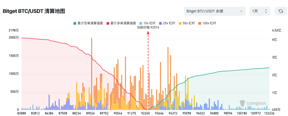 3、Bitget BTC/USDT 清算地图显示 BTC 当前价 92574 USDT, 90000-94000 区间多单清算密集,若下破或引发连锁清算风险,短线需警惕放量下跌;