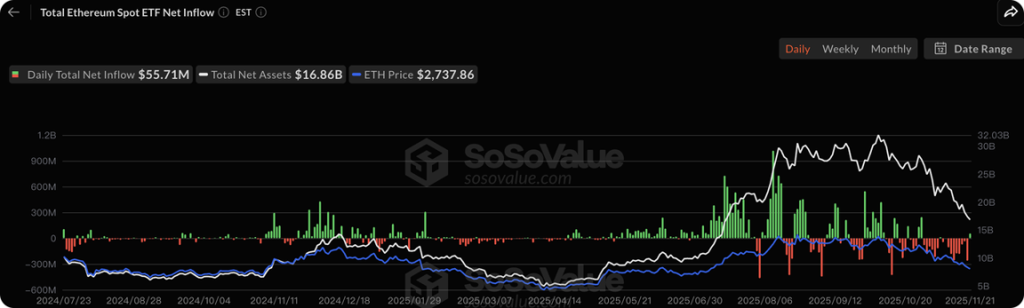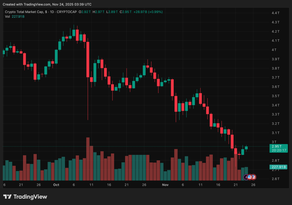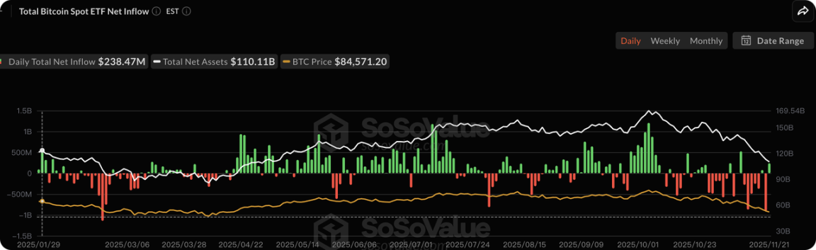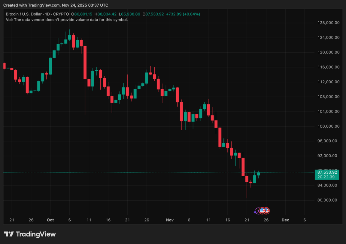在此背景下,比特币从前期约 96,000 美元高位一路回落,上周末先后跌破 93,714 美元关键位置并下探至约 80,600 美元,随后在降息预期回暖的带动下企稳反弹,短线一度回升到 88,000 美元附近,目前在 86,818 美元一线附近震荡。同期,全网加密货币总市值在周末两日的修复后重新接近 3 万亿美元关口,24 小时涨幅约 0.7%。从结构上看,11 月 21 日 BTC 日线收盘时,多家主要交易平台的现货成交量放大至近期高位,显示在低位出现了较为明显的放量换手,这种形态在历史上往往对应阶段性的短期底部,但能否演化为更持久的拐点,仍取决于后续宏观信号能否延续改善。