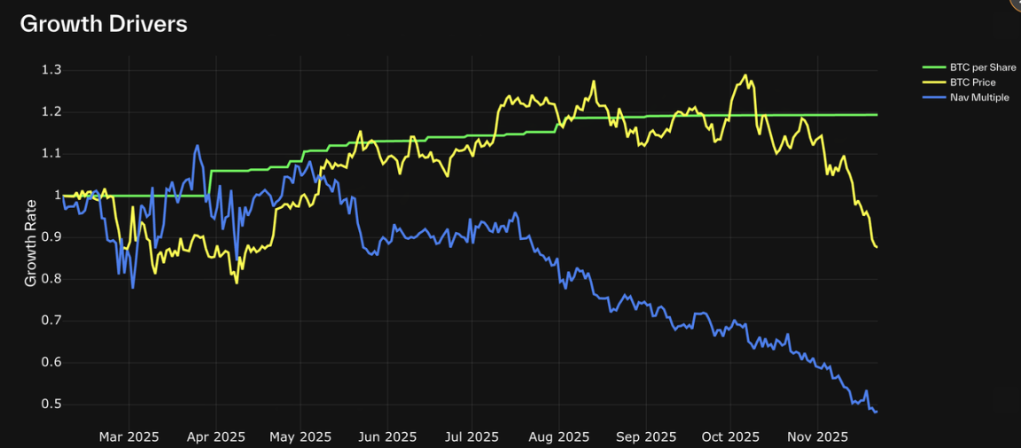 MSCI 发起这轮公众咨询的动因,在于希望在指数编制层面,更清晰地区分“以运营业务为主的传统公司”和“实质上提供高波动资产敞口的类载体”,避免股票指数被动承载过高的比特币间接仓位,并控制由此带来的集中度与跟踪误差风险。目前 MSCI 已启动公众咨询,计划在 2026 年 1 月 15 日前给出最终决定。在这一长期不确定性尚未落地的阶段,MSTR 的股价走势已明显弱于比特币,本轮跌幅显著大于 BTC,反映的是市场提前对“被动资金可能被迫减仓”的情景进行定价。