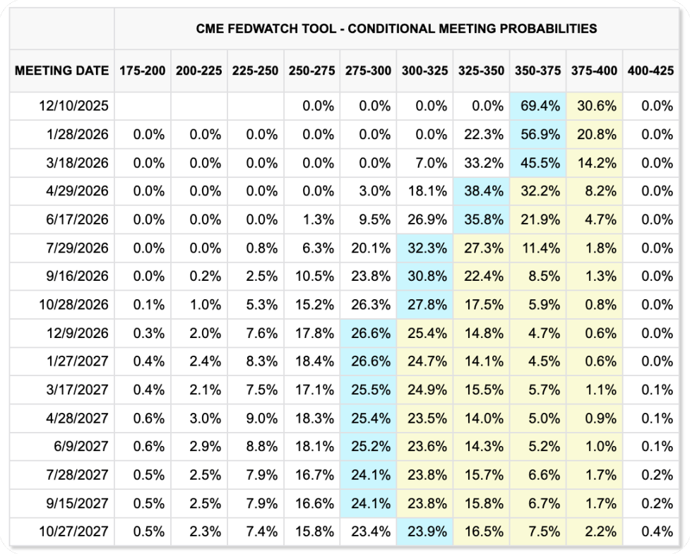 上周加密市场经历了一次典型的“宏观预期 + 内部事件”共振式巨震。宏观层面,在美国政府停摆余波下,通胀、就业等关键数据的发布被推迟、节奏被打乱,美联储在“统计仪表盘不完整”的情况下发声更显分歧:上半周多位官员释放偏鹰信号,市场对 12 月再降息的押注明显降温;其后部分官员口径转向温和,强调金融状况收紧和资产价格调整带来的风险,CME FedWatch 显示 12 月降息概率又被迅速抬回 70% 上方。降息预期在短时间内经历“急刹—回升”,叠加对 AI 泡沫的讨论升温,全球风险资产因定价锚反复摇摆而被迫剧烈重估。
