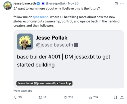 上周,Base 联创 Jesse Pollak 宣布在 Base App 上发行个人创作者代币 $JESSE,由其账户 jesse.base.eth 通过 Base App 内的 Zora Coins 模块发射,并将其定位为“内容币 + 创作者币飞轮”的一次实验:前者追踪短期关注度,后者承载长期内容价值,希望通过所有权与收益权的绑定,把创作者与粉丝拉进同一套激励闭环。对 Base 而言,这次发币也是一次高度可见的产品展示——Base App 被官方视作 “链上生活入口”,集内容分发、支付、聊天和资产交易于一体,用户可以在其中刷信息流、交易代币和 NFT,并用 USDC 获得年化约 3.8% 左右的收益。