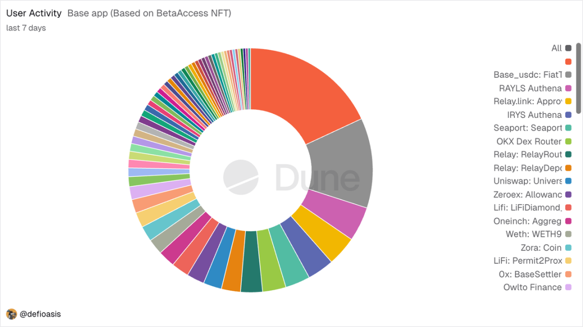 从交互结构来看,Base App 正在尝试把“日常使用场景”尽可能打包进同一个入口。过去 7 天内,用户在 App 内交互最频繁的合约,集中在 USDC、跨链组件 Relay Link、NFT 交易市场 OpenSea Seaport、用于空投验证的 IRYS/ Authena,以及 OKX DEX Router 等,这说明在“社交 + 内容”之外,稳定币支付、跨链兑换、NFT 交易与一键跳转到外部 DeFi,已经构成 Base App 当前的使用主干。其中,外界相对陌生的 Relay Link,在 App 内被深度嵌入,承担了高频路由与资产桥接角色。