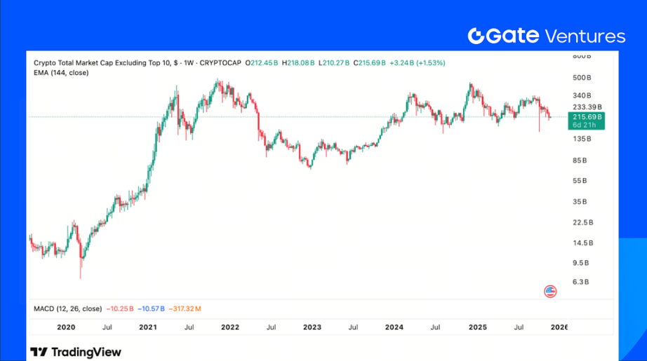 The total crypto market cap declined 7.48% last week. Excluding BTC and ETH, the broader market was down 5.89%, while assets outside the top 10 fell a sharper 9.18%. This indicates that altcoins experienced a noticeably heavier pullback compared with the major assets.