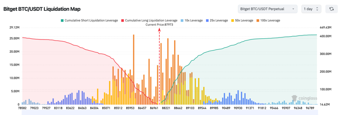3、Bitget BTC/USDT 清算地图显示:当前价 87,973 正处于“多头绞肉机”核心区,上方 88,200–91,000 堆积巨量 50x–100x 多单,突破 91k 将引爆多头清算瀑布直冲 95k+;下方空头清算墙极薄,跌破 86k 几乎无强支撑,市场极度一面倒看多,假突破猎杀风险高。