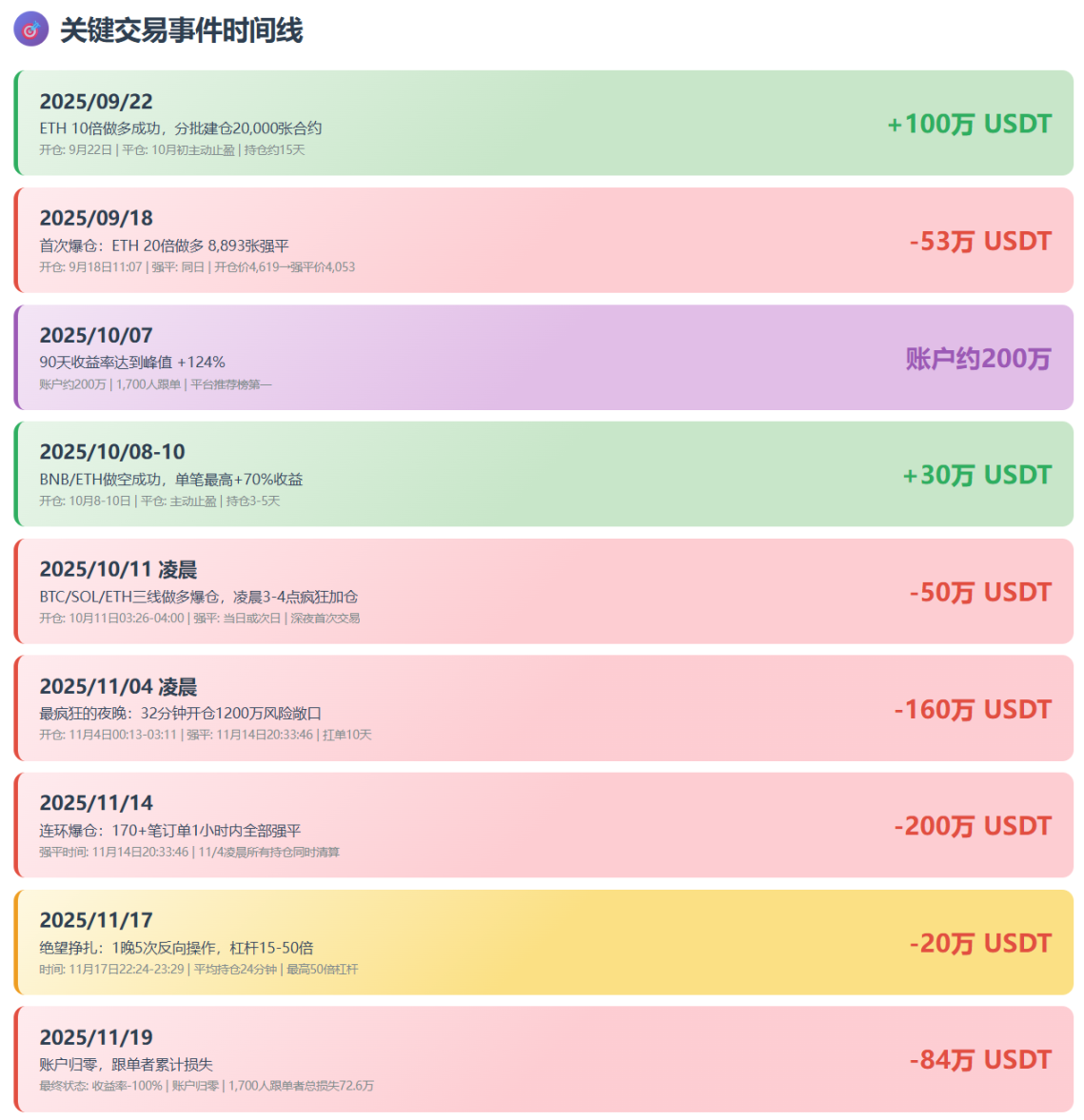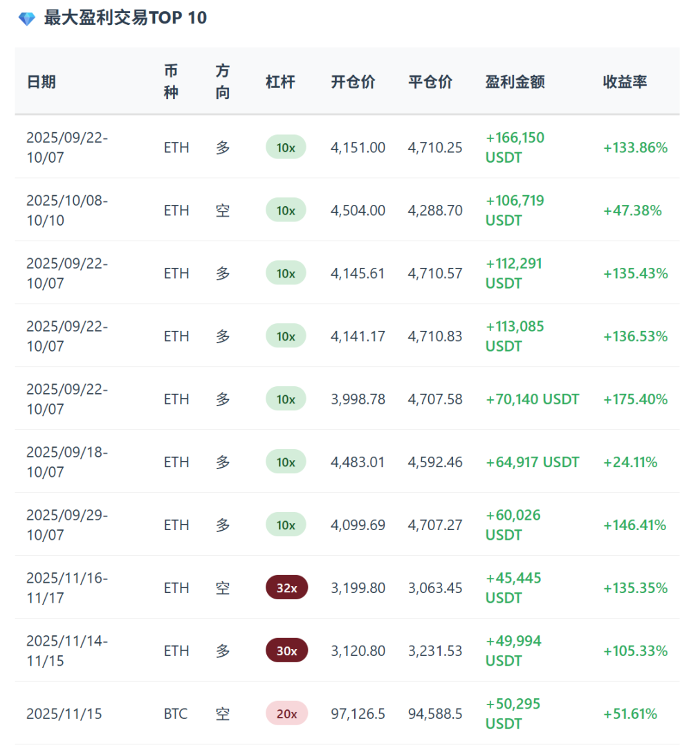 从数据可以看出,即使在 11 月中旬(已经接近崩溃边缘),他仍然能做出单笔盈利 5 万 USDT 的交易。11 月 16-17 日的 ETH 空单使用 32 倍杠杆(已经很危险),但仍然获得了 +135.35% 的收益。这说明他的技术分析能力一直都在,只是被情绪和贪婪吞噬了。