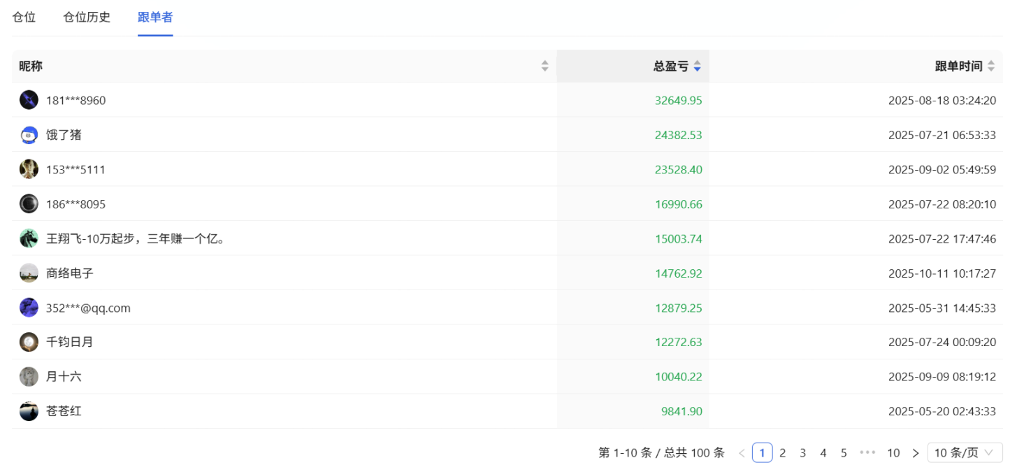 跟单 TOP 100 用户账面的盈利约 20-30 万 USDT,他们中绝大部分都是在 9 月份之前参与早期跟单者,那么后期跟单者的累计亏损可能超过 90-100 万 USDT。这些人被 9 月 -10 月的亮眼表现吸引而来,却成了最惨的接盘侠。 这揭示了跟单最残酷的真相:同一个带单员,进场时间不同,结局天差地别。