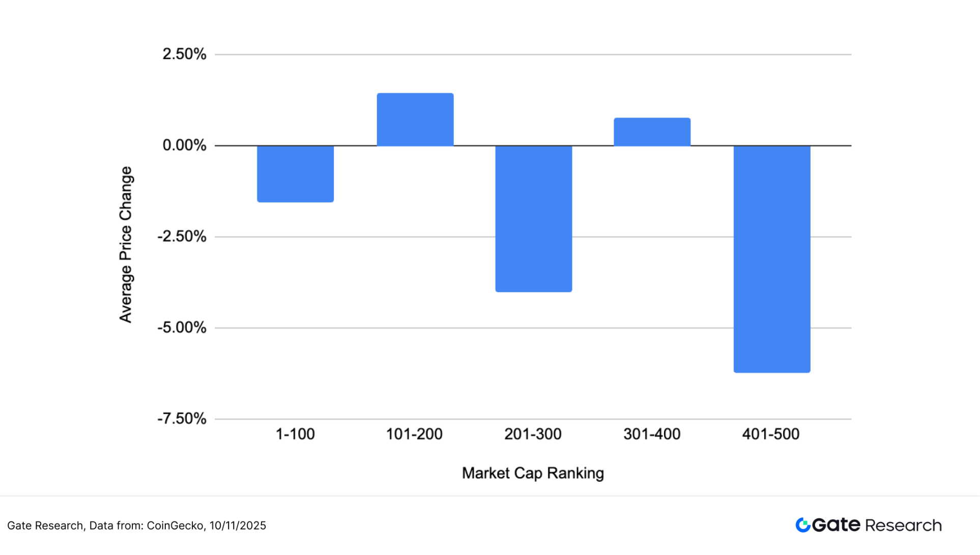 备注:市值分布以 CoinGecko 数据为基础,将市值排名前 500 的代币按每 100 个进行分组(如排名 1–100、101–200 等),统计各组内代币在 2025 年 10 月 28 日至 11 月 10 日期间的价格涨跌幅,并计算每组的平均值,作为该市值区间的平均涨幅指标。整体平均跌幅(1.91%)为市值前 500 名代币个体涨幅的平均值,未加权。