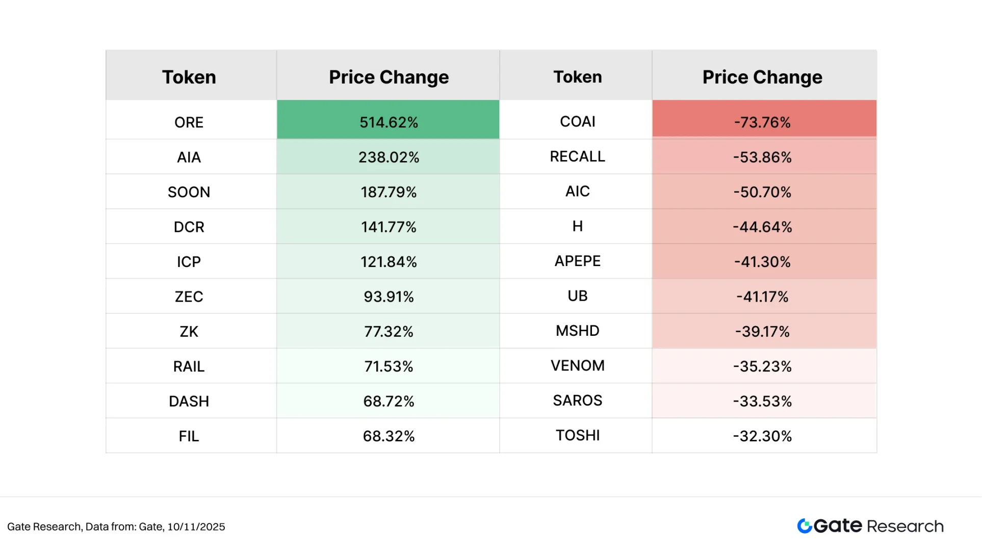 在涨幅显著的代币中,ORE(+514.62%)与 AIA(+238.02%)涨势最为突出,分别受益于 PoW 通缩机制热度提升与 AI+Agent 概念升温;SOON(+187.79%)与 DCR(+141.77%)亦表现强劲,反映出市场在盘整阶段仍存结构性机会。相对而言,跌幅榜集中于前期过热或题材退潮的项目,如 COAI(-73.76%)、AIC(-50.70%)与 RECALL(-53.86%),多数在短线资金退潮后出现较深调整。