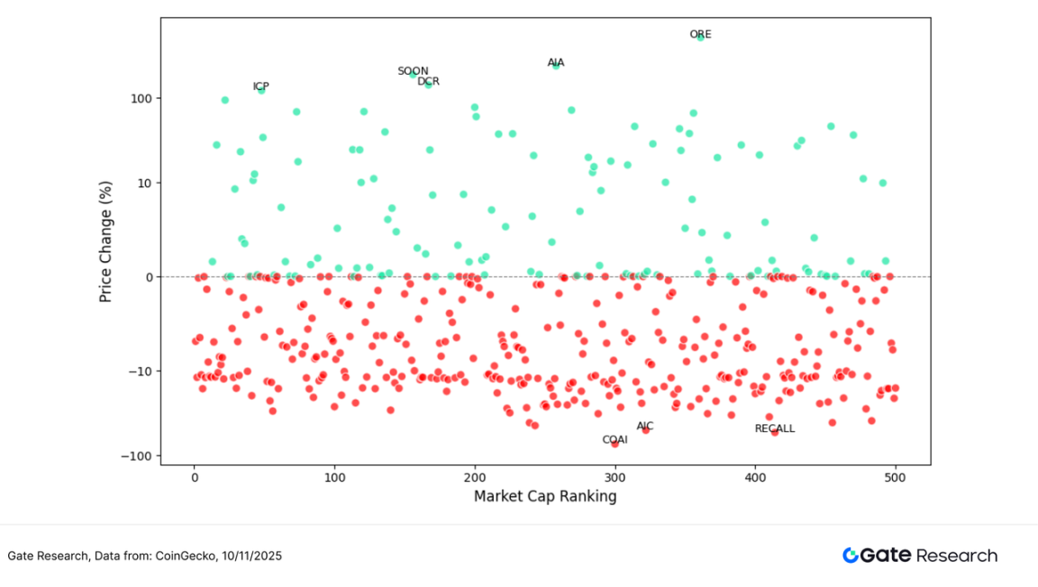 为观察本轮行情中代币表现的结构特征,本文绘制了市值前 500 名代币的散点分布图。横轴为市值排名(越靠左市值越大),纵轴为 10 月 28 日至 11 月 10 日期间的价格涨跌幅。图中每个圆点代表一个代币,其中绿色代表上涨、红色代表下跌。