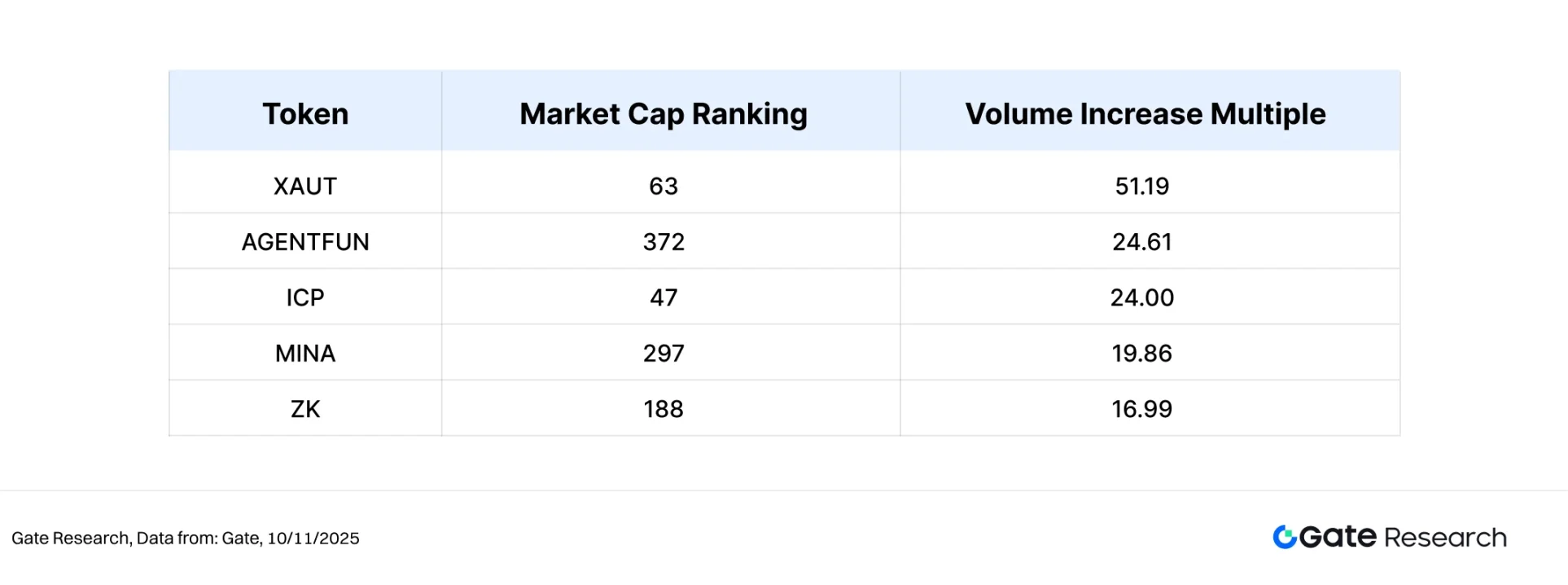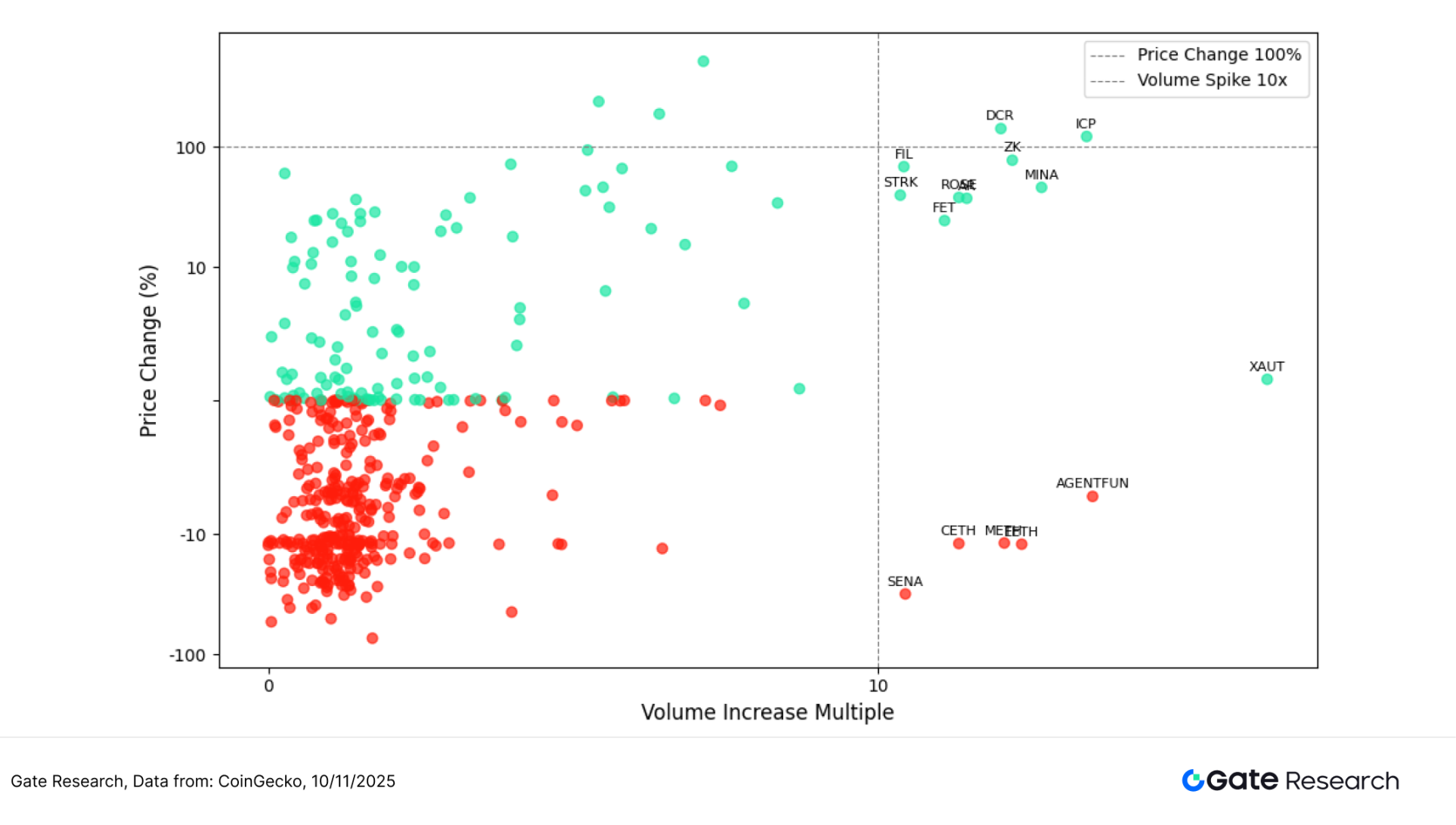 MINA(+45.93%)与 ZK(+77.32%)亦呈现放量上行,显示市场对零知识(ZK)与轻量公链叙事的再度关注。整体来看,本期放量项目涵盖避险、隐私与基础设施等不同主题,资金参与度显著上升。部分项目虽未出现明显价格上涨,但放量现象显示市场对这些赛道的关注度正在积聚,潜在的资金轮动与题材发酵仍在持续。