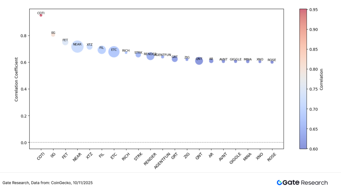 整体而言,市场呈现出明显的“相关性分层”结构:AI 与数据类项目量价联动性最强、波动高;基础设施与隐私类资产则相对稳健,反映资金对高弹性板块的偏好在当前阶段依旧显著。
