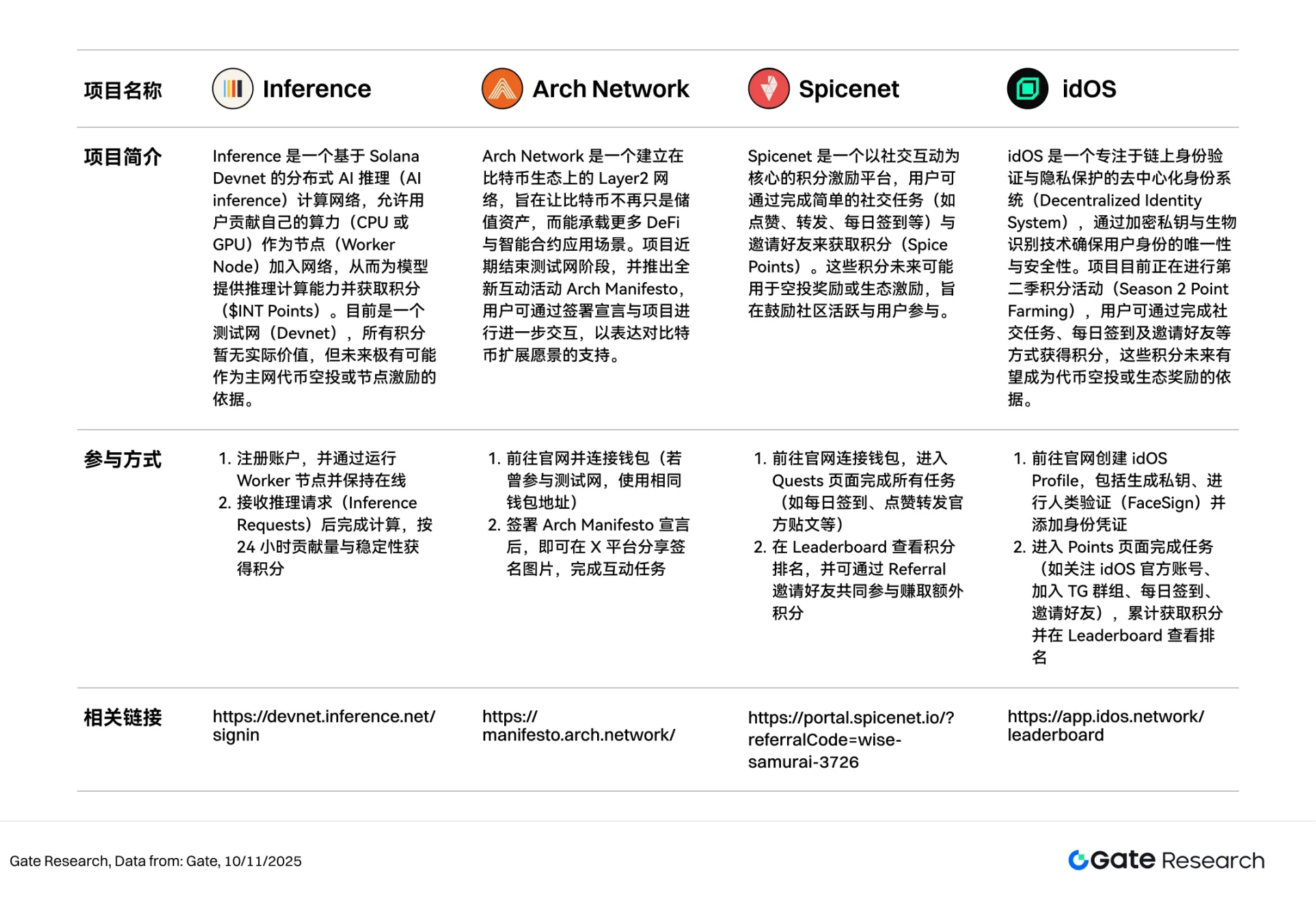 此外,本期追踪的 Inference、Arch Network、Spicenet 与 idOS 均处于活跃的激励阶段,方向分别聚焦于 AI 计算网络、比特币 Layer2 扩展、社交积分体系与链上身份验证,生态定位互补、激励路径清晰。用户可依项目特性参与任务以提升积分与潜在空投权重。建议持续关注各项目公告与任务更新节奏,抢占早期红利机会。