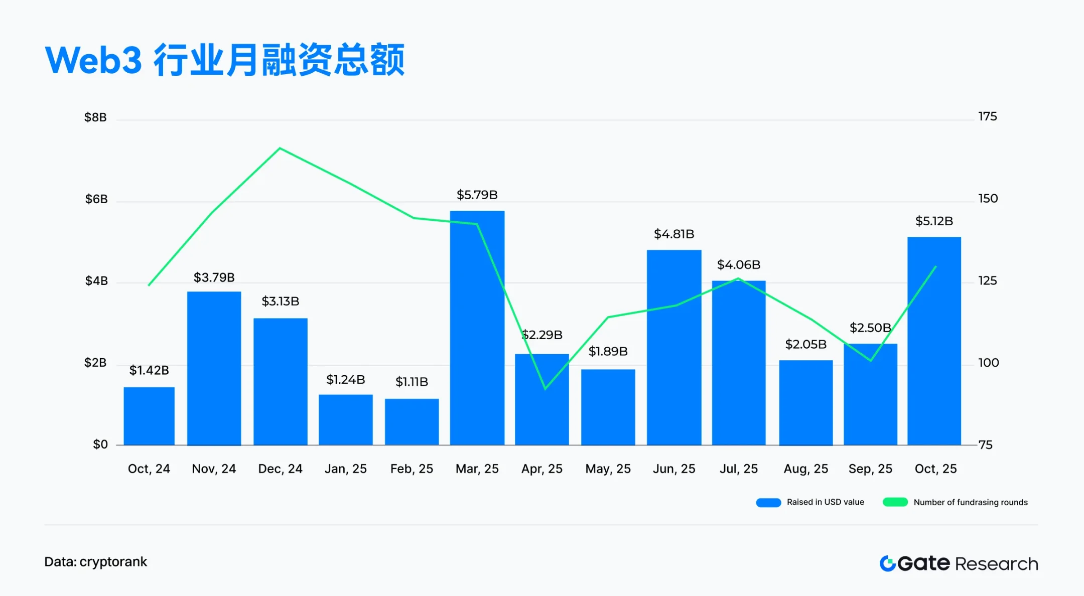 • 根据 Cryptorank 于 2025 年 11 月 4 日发布的数据,2025 年 10 月 Web3 行业共完成 130 笔融资,融资总额达 51.2 亿美元;融资笔数环比增长 28.43%,融资总额更是大幅上升 104.8%,创下近一年以来的第二高水平。