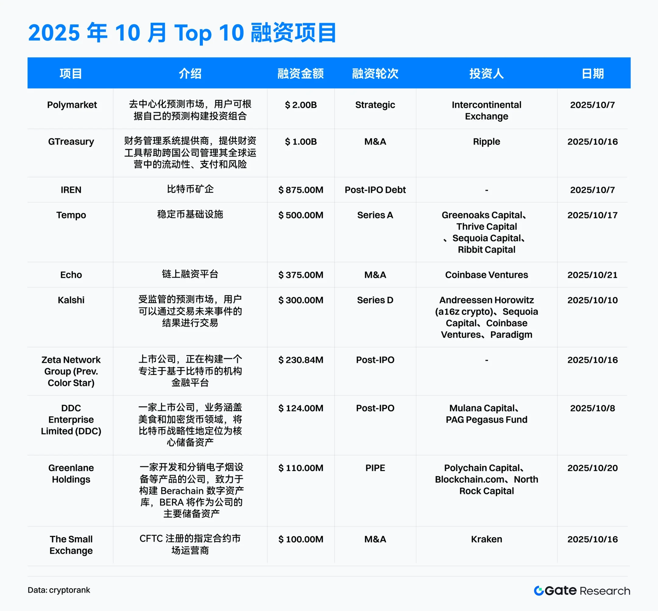 2. CeFi 赛道继续通过并购与传统金融工具实现扩张。从融资方式来看,传统资本工具的占比显著提升,包括并购、私募股权投资(PIPE)及上市后债务(Post-IPO Debt)等结构化融资形式。Ripple 收购企业财资平台 GTreasury(10 亿美元),仅次于 Polymarket 的战略融资,进一步巩固其在企业级支付与流动性管理领域的布局。Coinbase Ventures 收购链上融资平台 Echo(3.75 亿美元),以及 Kraken 收购 The Small Exchange(1 亿美元),显示 CeFi 龙头正通过垂直整合强化自身服务能力,加速 Web3 与传统金融基础设施的深度融合。此外,IREN(8.75 亿美元,可转换债券) 与 Zeta Network Group(2.3 亿美元,Post-IPO 私募) 通过资本市场渠道获得机构资金,反映出上市及准上市企业正逐步将加密资产纳入其财务结构与战略储备。与此同时,Greenlane Holdings(1.1 亿美元 PIPE) 宣布建立 Berachain 数字资产库,标志“链上国库”模式进一步深化,成为传统企业进入 Web3 的新常态。