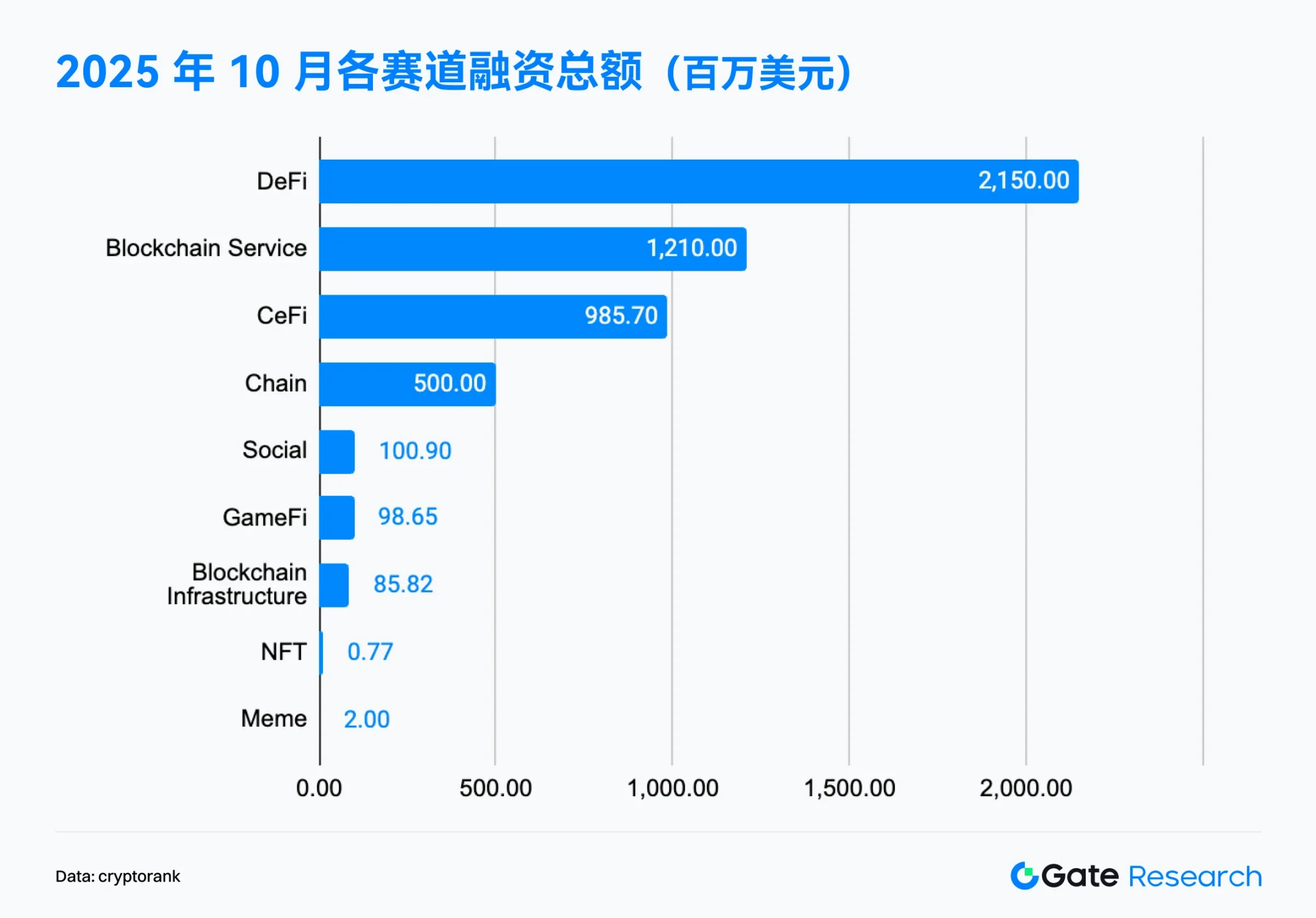 区块链服务与 CeFi 继续构成资金流入的稳健基石。区块链服务融资额达 12.1 亿美元,在 9 月的基础上稳步增长,巩固了其作为 Web3 基础设施核心支撑的地位。CeFi 以 9.86 亿美元位列第三,受 Ripple、Kraken 等巨头推动的多起高额并购交易带动,显示出 CeFi 在合规化扩张与市场整合方面的持续资金需求。