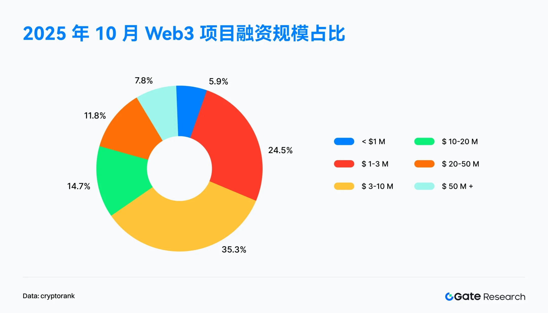 小额融资显著下滑。 100 万美元以下的项目仅占 5.9%,创下近月新低,显示初创团队获资难度加大,投资者更加重视产品成熟度与市场验证信号,对“纯概念型”项目的筛选标准正变得更加严格。