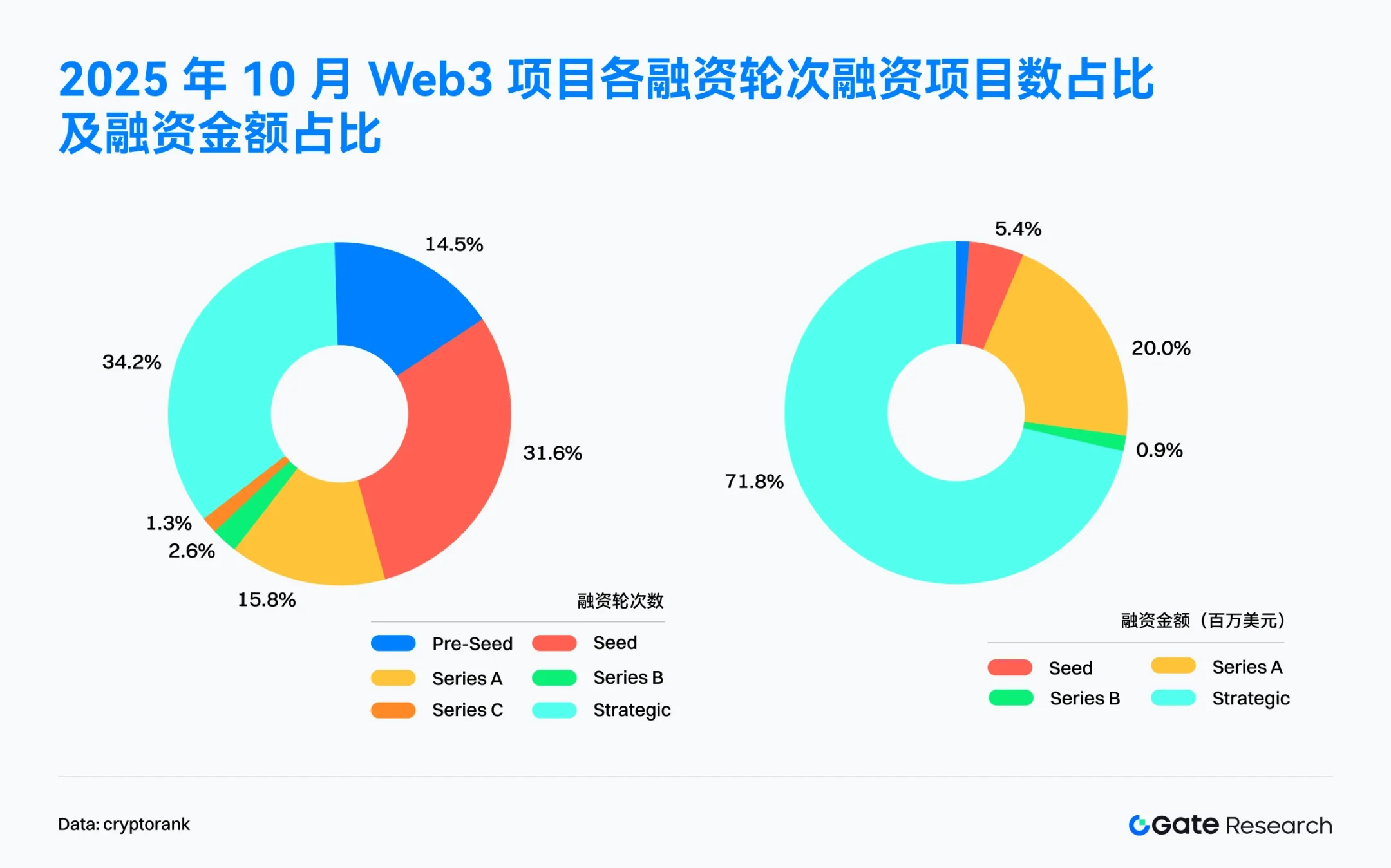 根据 2025 年 10 月披露的 76 起 Web3 项目融资数据来看,各轮次融资结构呈现出“战略资本主导、早期创新活跃”的双极格局,显示市场资金在经历多月收缩后,正加速向头部项目与核心基础设施集中。