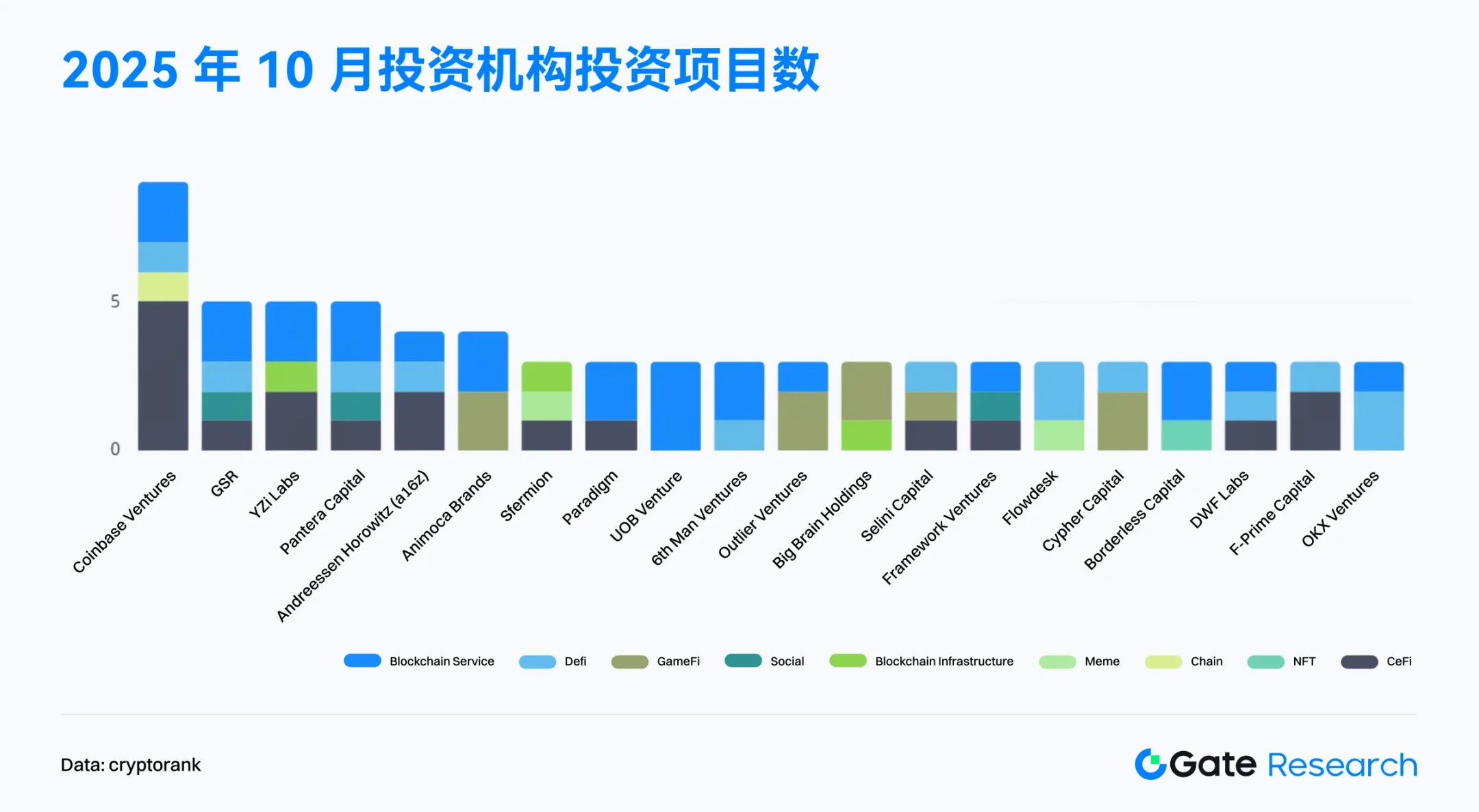 从赛道分布来看,Blockchain Service 与 CeFi 成为主要投资热点,也是多数头部机构共同押注的重点方向,反映出市场对金融服务与基础设施赛道的长期战略性看好。其次为 DeFi 与 GameFi,显示出流动性管理、链上收益及用户娱乐化交互仍具投资吸引力。而 NFT、Social 与 Meme 等板块的投资关注度相对较低,说明资本更倾向于回归具备可持续商业模式与稳定现金流的领域。