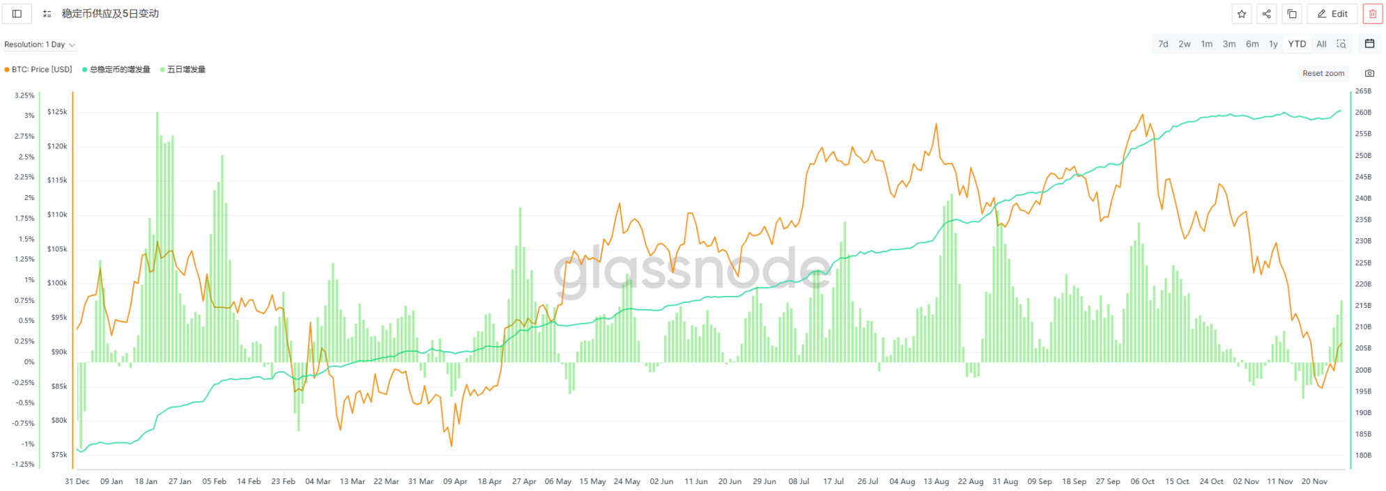 从近几个月单周增发量来看,本周 20.12 亿美元的单周增发量已接近 10 月份大盘下跌前的单周平均增发水平。本周大盘同步迎来反弹,后续反弹能否持续,需重点关注下周稳定币增发速度能否维持回温态势。
