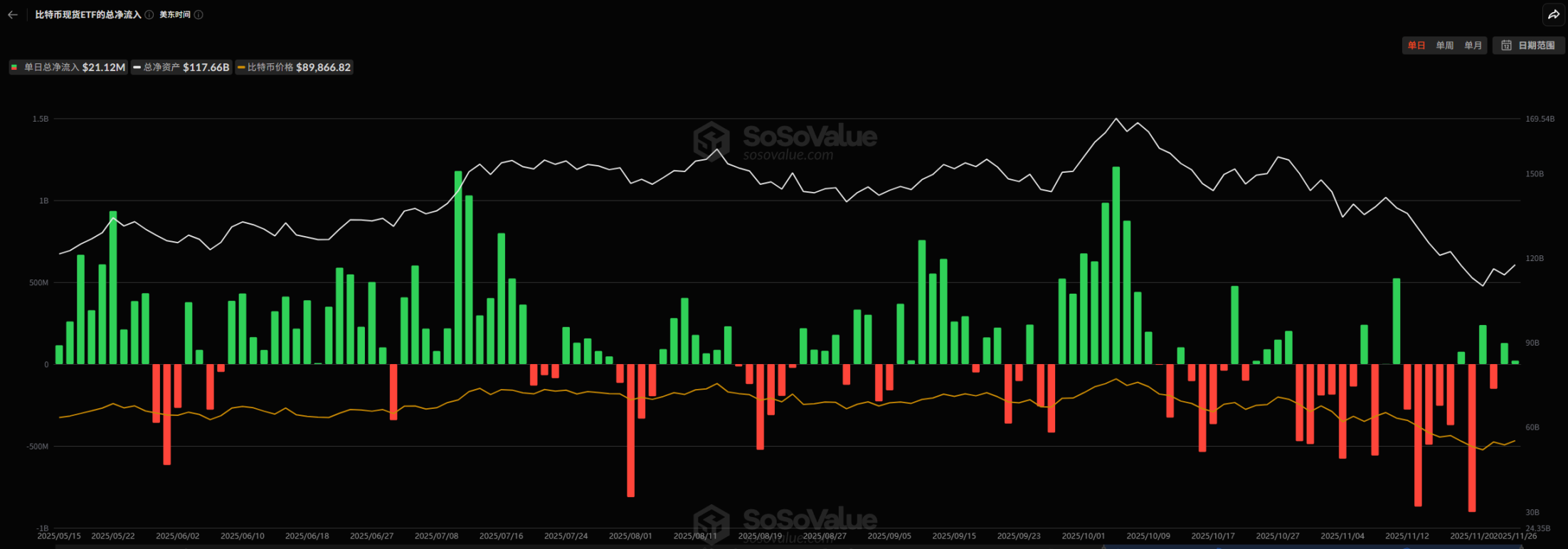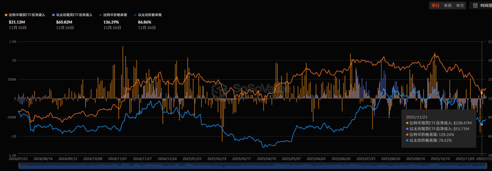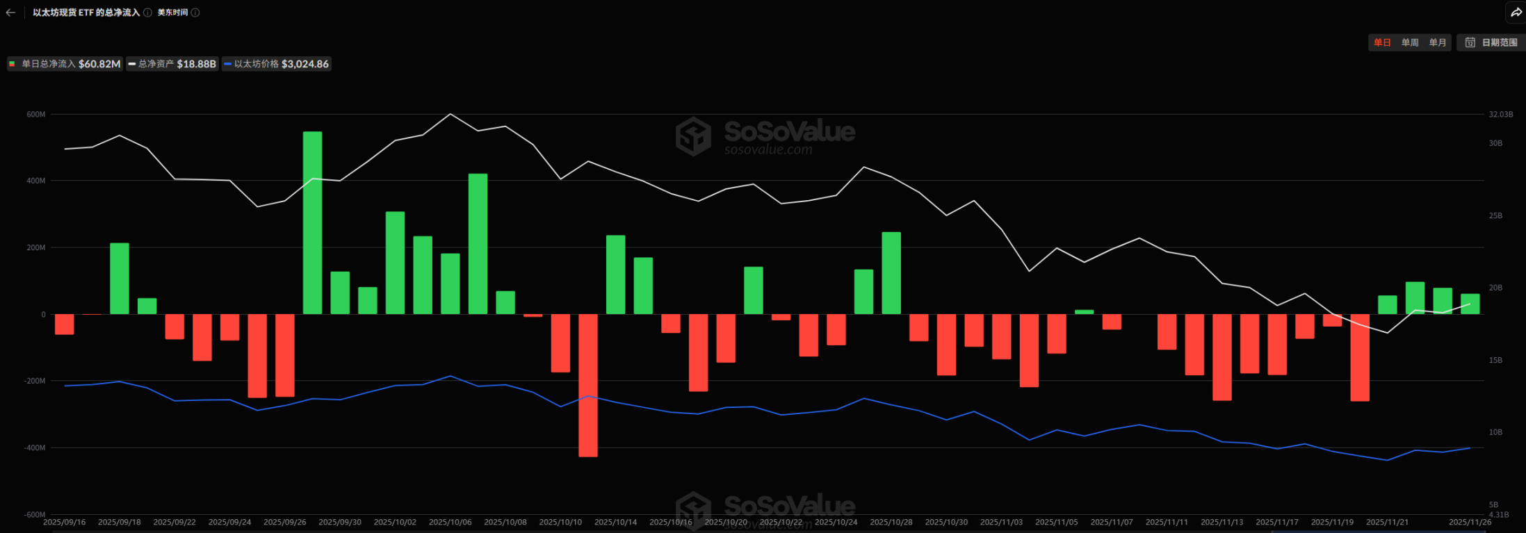 本周(11.22-11.28)比特币 ETF 资金流动出现回温,单周净流入 2.3715 亿美元,而上周为 19.4703 亿美元净流出,当前已恢复至净流入状态。同期比特币价格也迎来反弹,但结合本周小幅净流入规模来看,此次反弹暂只能定义为短期反弹,尚不足以判定行情将迎来反转,后续需持续跟踪下周 ETF 净流入情况以进一步判断行情走向。