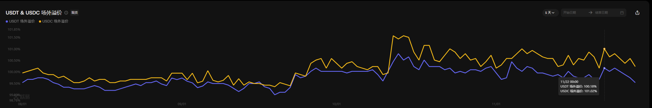 本周(11.22-11.28),从 USDT 和 USDC 的场外溢价率来看,11 月 22 日 - 23 日市场加速下跌期间,场外资金抄底情绪有所升温,推动溢价率上升至小高点。但随着市场逐步反弹,USDT 和 USDC 的场外溢价率开始逐步回落,表明当前场外资金情绪相对冷静,更倾向于在大盘下跌时抄底,而非在反弹阶段追涨。