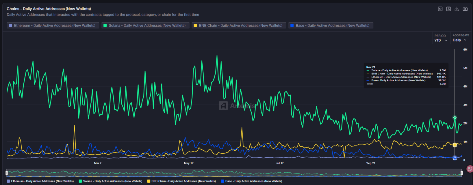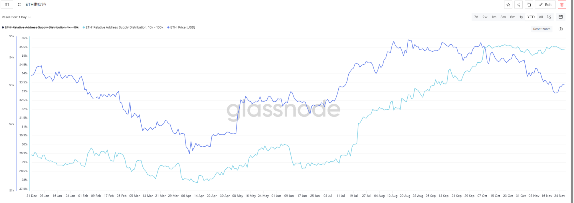本周(11.22-11.28),以太坊持币地址中,持币量大于 10K 且小于 100K 的地址持币占比再次向下拐头,从 35.547% 回落至 35.346%。从近一年走势来看,该区间持币地址的持币占比与 ETH 价格走势呈正相关,当前持币占比回落与 ETH 价格反弹形成背离,若后续这一拐头趋势持续,ETH 需警惕再次回调的风险。