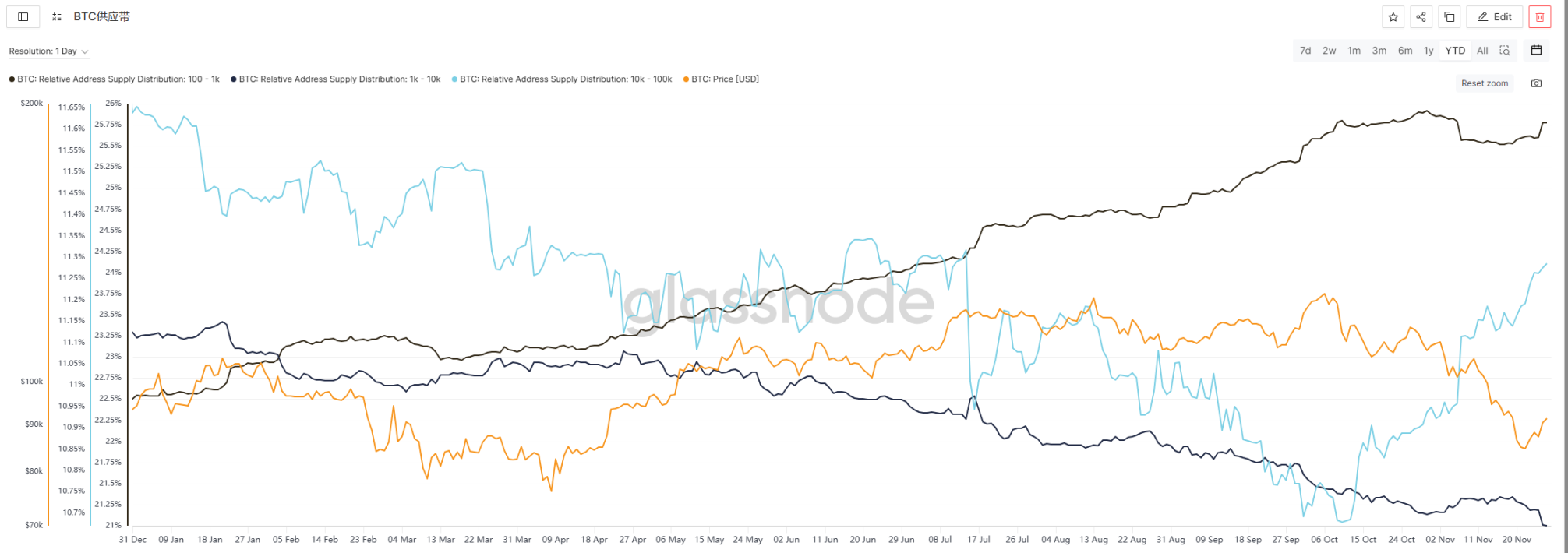 从比特币持币地址持币占比来看,本周(11.22-11.28)持币量大于 100 且小于 1K 的地址持币占比小幅向上,从 25.534% 升至 25.776%,表明该部分地址本周整体呈增持态势;持币量大于 10K 且小于 100K 的地址持币占比进一步反弹,从 10 月 11 日的 10.678% 升至当前的 11.286%,同样持续增持;而持币量大于 1K 且小于 10K 的地址持币占比则出现拐头回落,从 21.342% 降至 21%,整体呈减持状态。