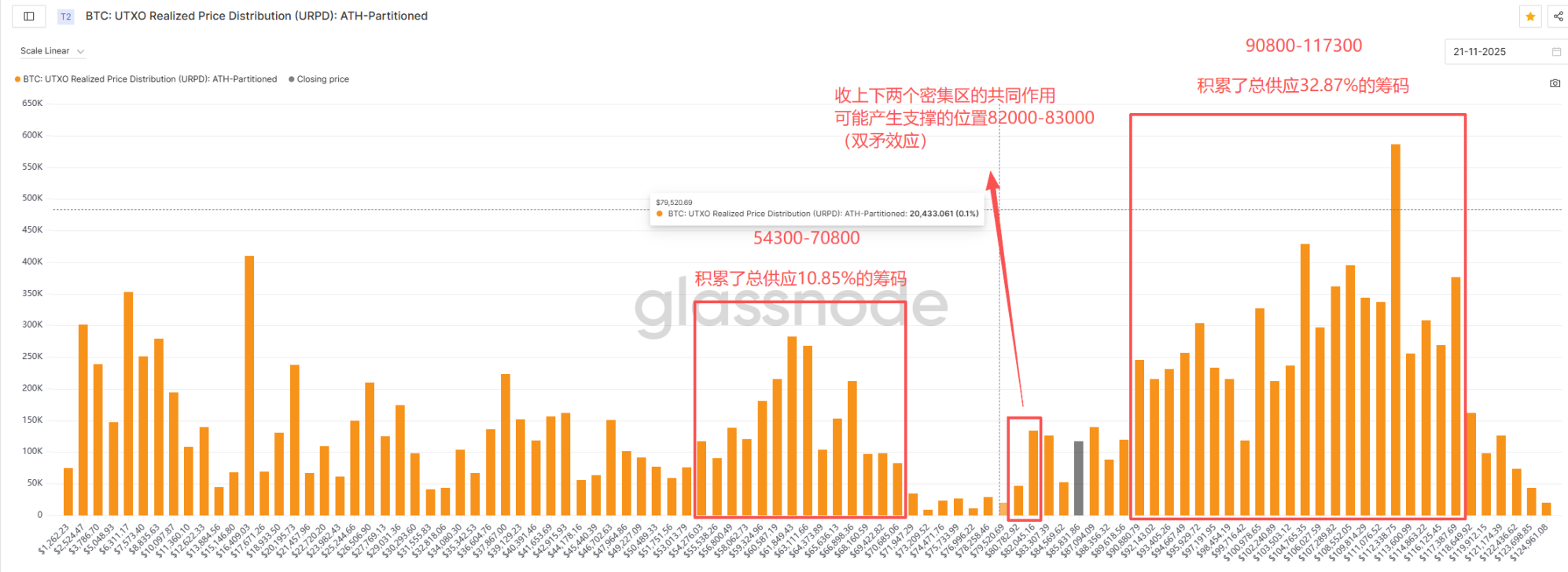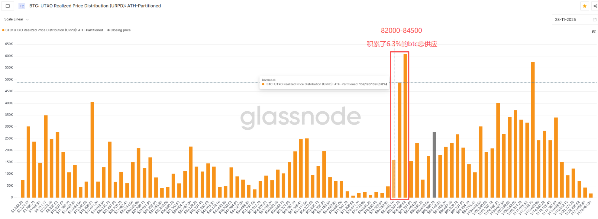 从比特币筹码分布来看,上周曾提及 BTC 跌破上方 90800-117300 筹码密集区后,下方较明显的筹码密集区位于 54300-70800。基于筹码结构双锚效应,BTC 可能在上下两个筹码堆积区中间的 82000-83300 附近形成支撑。本周 BTC 如期回落至该区域附近并产生支撑,随后开启反弹,且目前 82000-84500 区间出现大量换手,积累了 BTC 总供应 6.3% 的筹码。