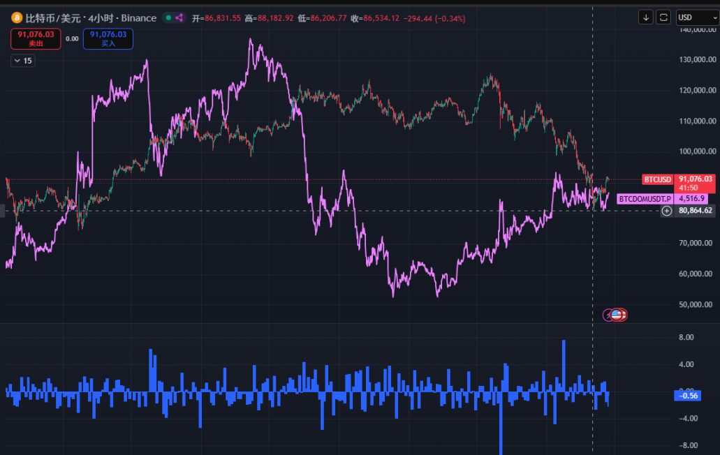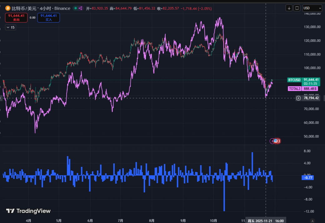 周五晚间,一位美联储官员发表鸽派讲话,成为市场止跌反弹的关键信号。不过,此次反弹初期走势并不流畅,23 日反弹至 87000 左右后,形成中继形态,后续继续反弹至 92000,但 92000 位置存在明显阻力,短期内突破难度较大。