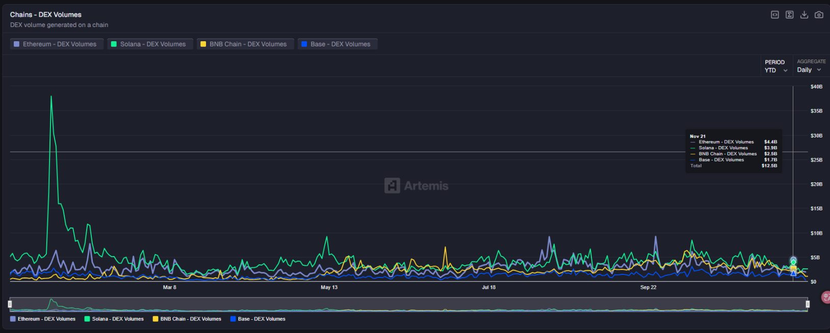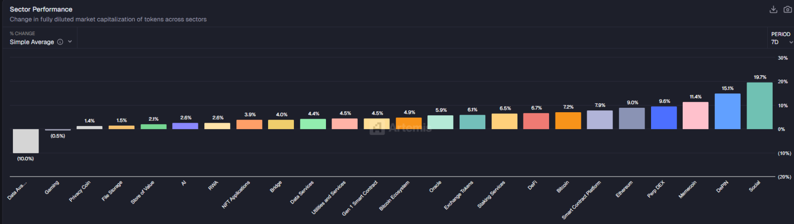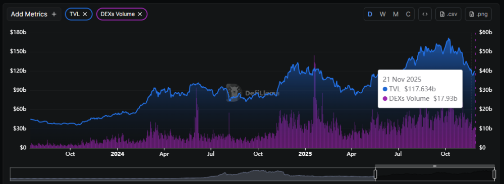 本周五 TOTAL3(除 BTC、ETH 外全代币市值)达 8885 亿美元,环比增长 3.0%。上周五美股阶段性企稳后,BTC 放量下跌完成阶段性筑底,叠加美联储官员释放鸽派信号及 12 月降息概率增加,市场情绪得到大幅修复。本周整体呈震荡缓慢走高态势,但风险偏好恢复速度相对较慢,与股市相比依旧偏弱,BTC 100000 压力位较为显著。