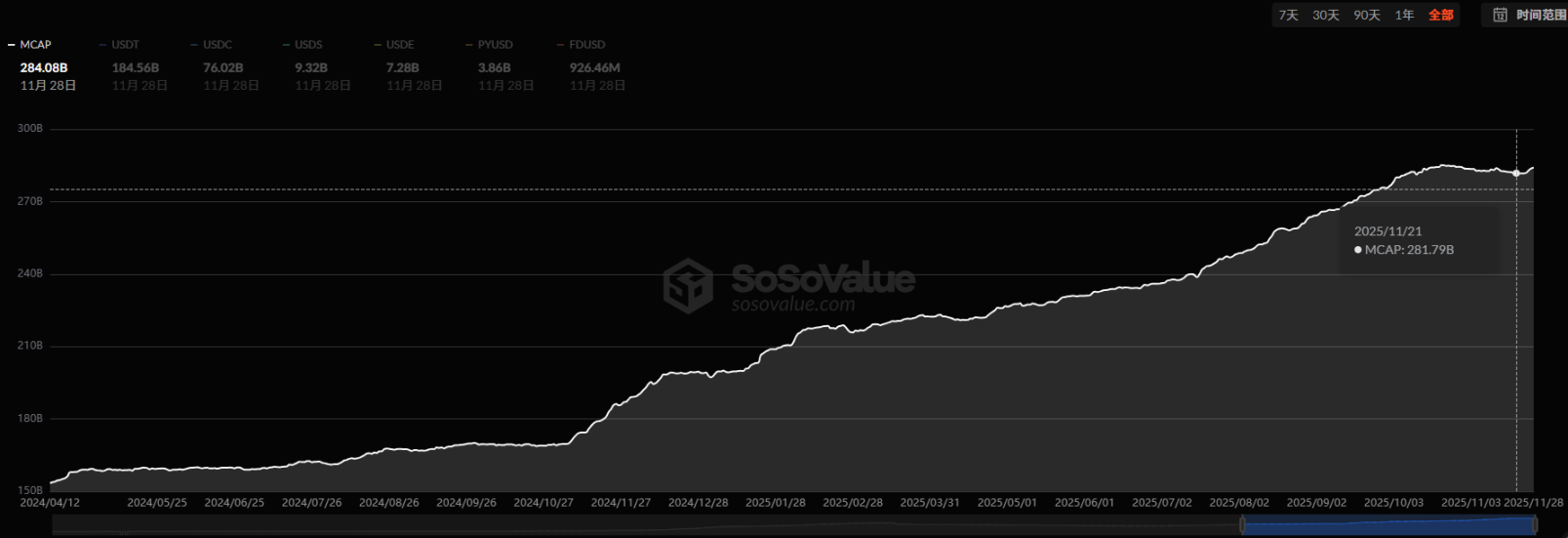 本周(11.22-11.28)稳定币增发水平显著回温,单周增发量从上周的 - 10.01 亿美元增至 20.12 亿美元,日均增发水平也从 - 1.43 亿美元上升至 2.87 亿美元,环比增幅达 300%。