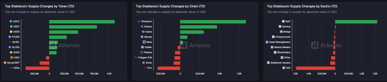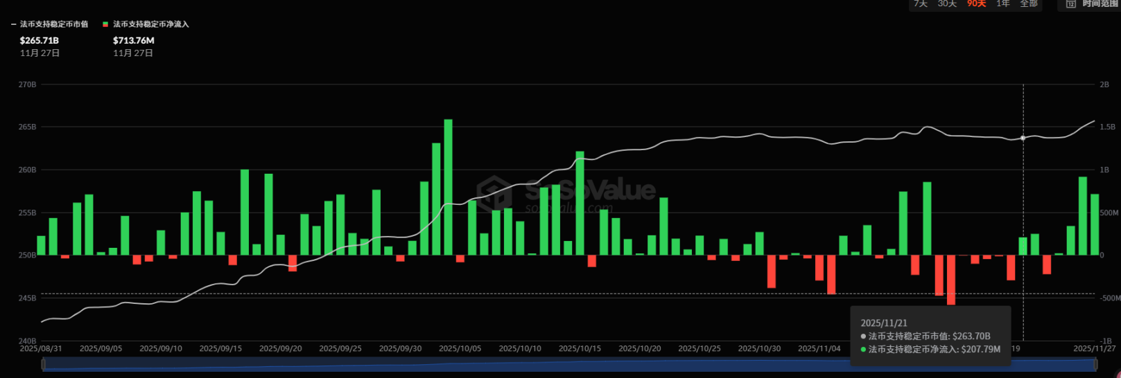 法币支持稳定币截至本周五合计净流入 22 亿美元,与整体市场趋势相符。稳定币总市值达 2841 亿美元,环比上升 0.82%。本周随着市场情绪回暖、价格上升,稳定币总量恢复上涨。从整体走势来看,稳定币绝大部分时间呈上涨趋势,仅在行情较差时出现流出,当前市场情绪已明显扭转,后期大概率将陆续恢复上涨。